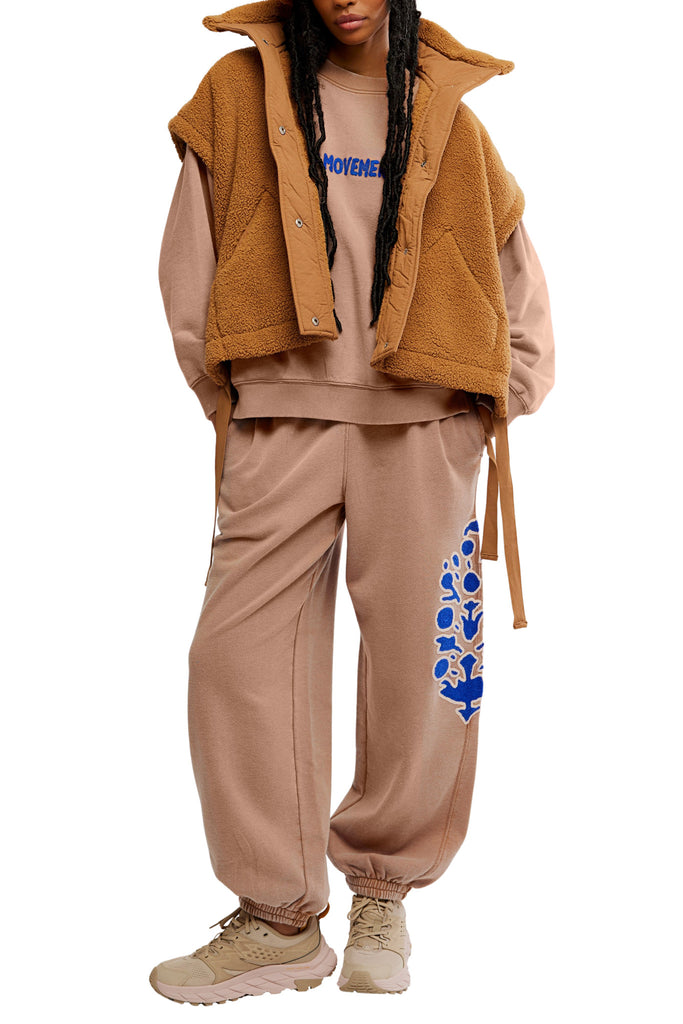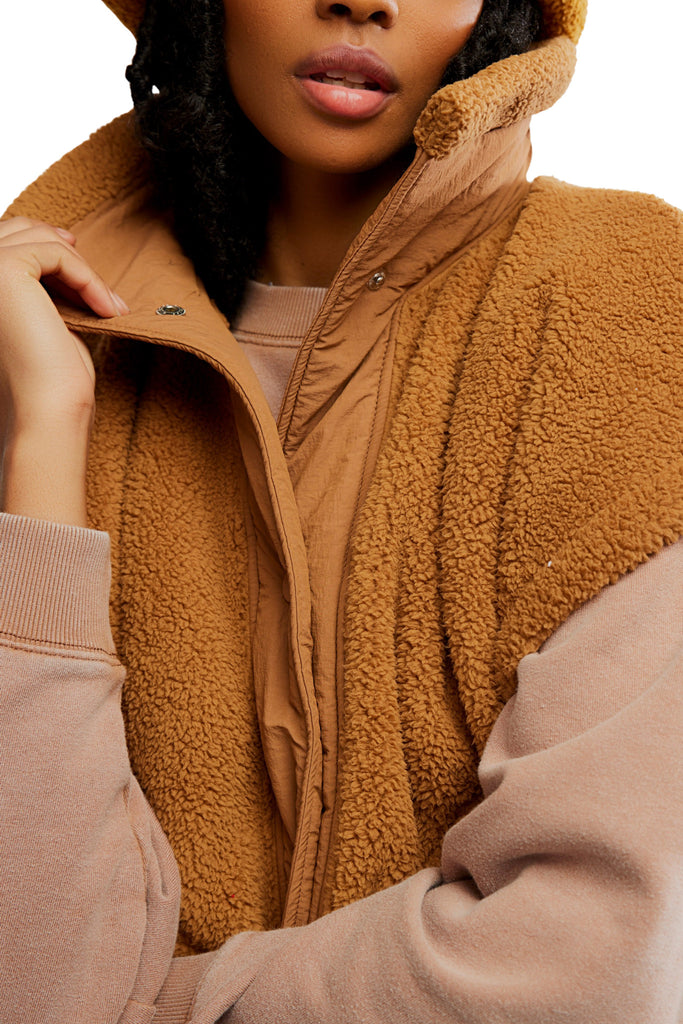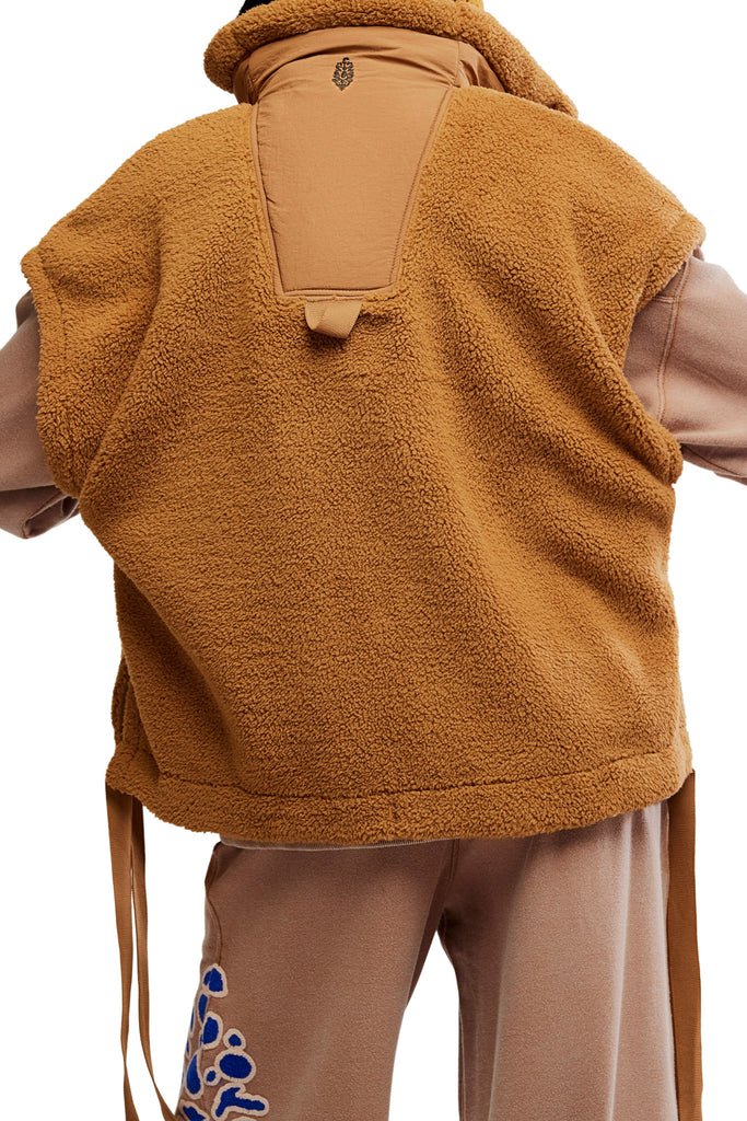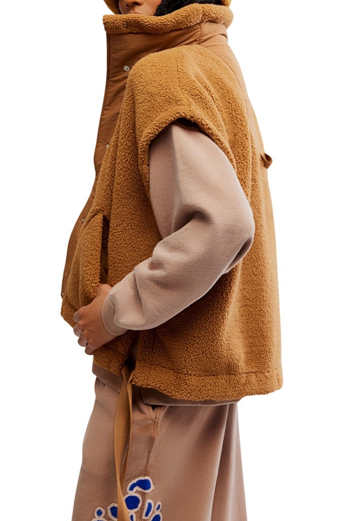 Personify Shopfree people sporty vest in warm camel brown. high neck vest has an oversized, boxy fit and features a warm fleece fabrication, contrast nylon paneling, boxy short sleeves, a rubber coated snap-front placket, high funnel neck, jersey lined pockets, adjustable drawcord at hem, and a locker loop and embroidered logo on back. warm, water-resistant vest is perfect to throw on post-workout or to wear as a special accent to an everyday outfit.