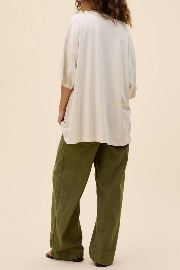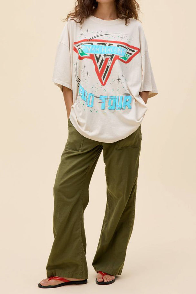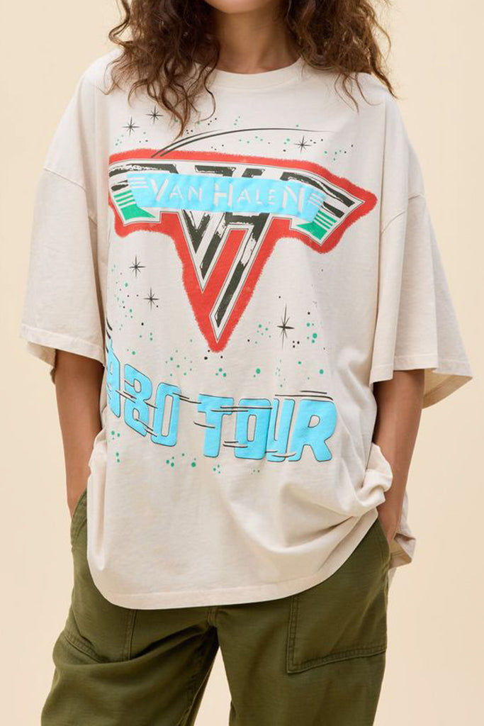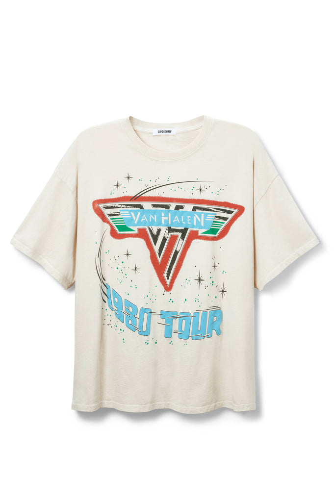Personify Shopdaydreamer one size tee celebrating van halen's 1980 world tour. tee is designed to feel like a show souvenir and features the band's iconic logo and an 80s inspired colorway. tee is accented in special puffed ink. exaggerated and oversized tee can be worn baggy with denim or pairs perfectly with a pair of bike shorts or leggings.