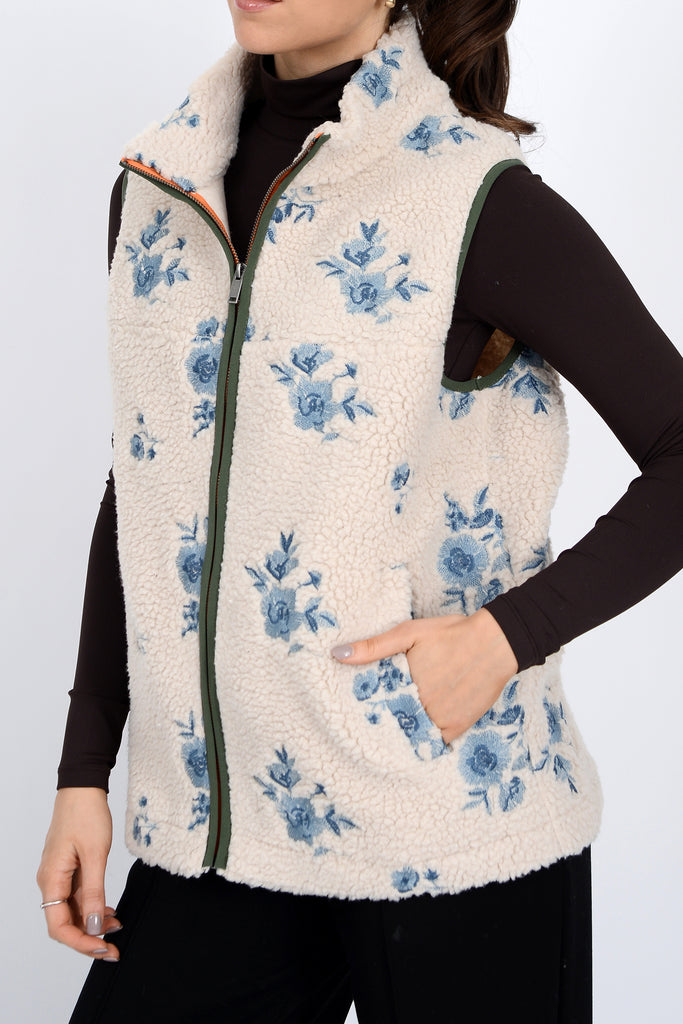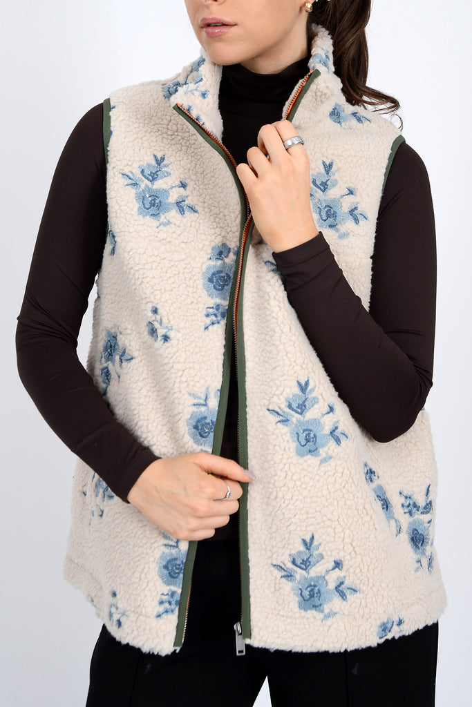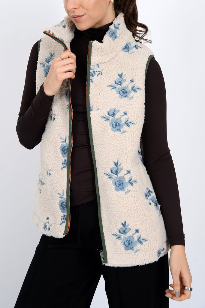 Personify Shopfuzzy cream-colored sherpa vest with blue embroidered floral details. cozy vest features a high neckline, a zippered front in contrasting olive green and orange, side pockets, and a relaxed fit. vest makes a cozy top layer to wear all fall and winter long.