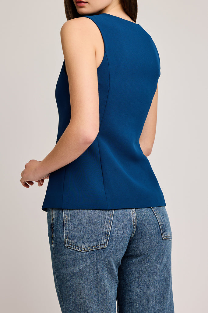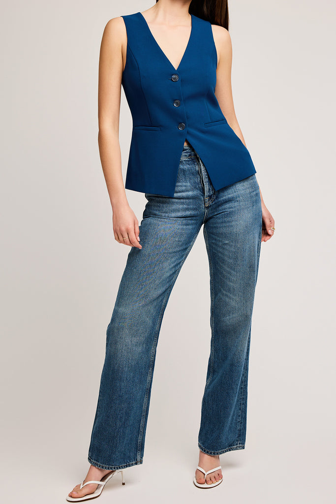 Personify Shopsuit-inspired vest in deep ocean-blue. chic vest features a v neckline, button front, slash pockets, and a close to the body fit. gorgeous vest can be worn solo or layered and can be worn professionally or casually. note: vest runs slim, so consider sizing up if you are busty.