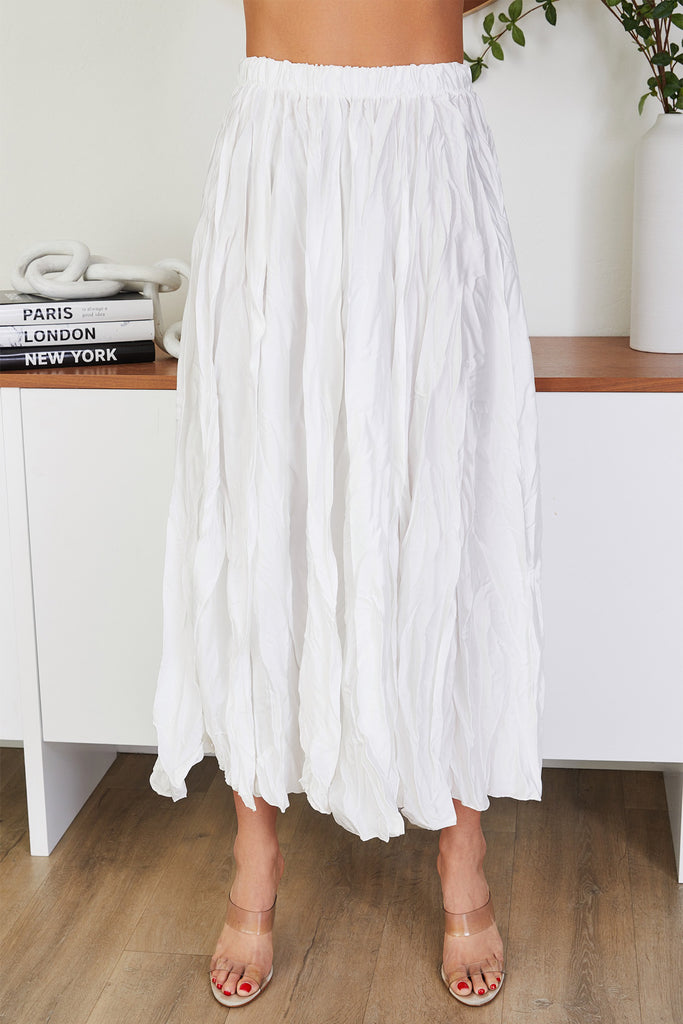 Personify Shopversatile maxi skirt made from white crinkled material. generously sized skirt has a high-waisted fit with a stretchy elastic waistband and a flowy look. skirt has a festival-inspired look, but can be dressed up or worn more casually (we love this skirt paired with a daydreamer tee!).