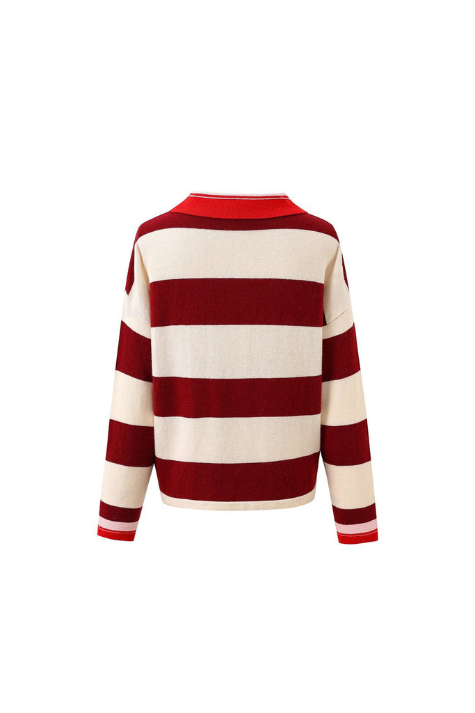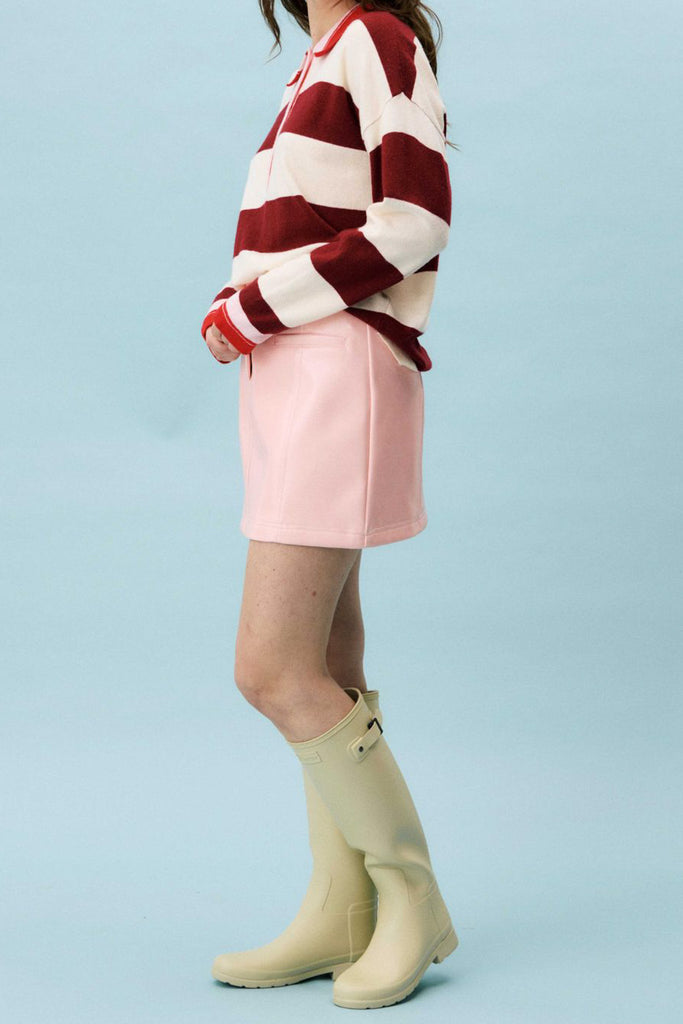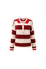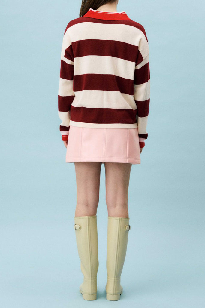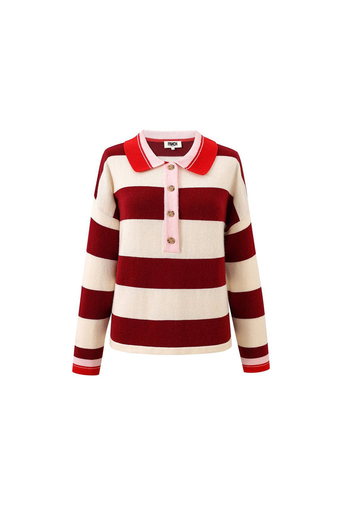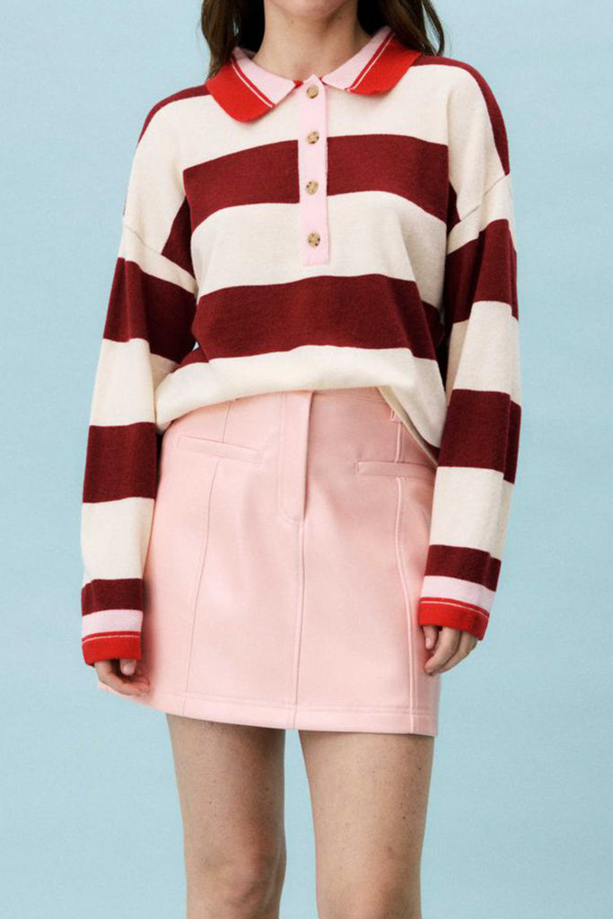 rugby stripe sweater in wine and white wide stripes with fun color blocked details. sweater has a soft, luxe-feeling fabrication. polo-style sweater features a red collar, pink half button front, dropped shoulders, roomy long sleeves, and a straight, slightly oversized fit. pair with the amena skirt for the look pictured here or wear with your favorite jeans for a cozy, casual look. we recommend sizing down if you are between sizes.
