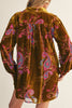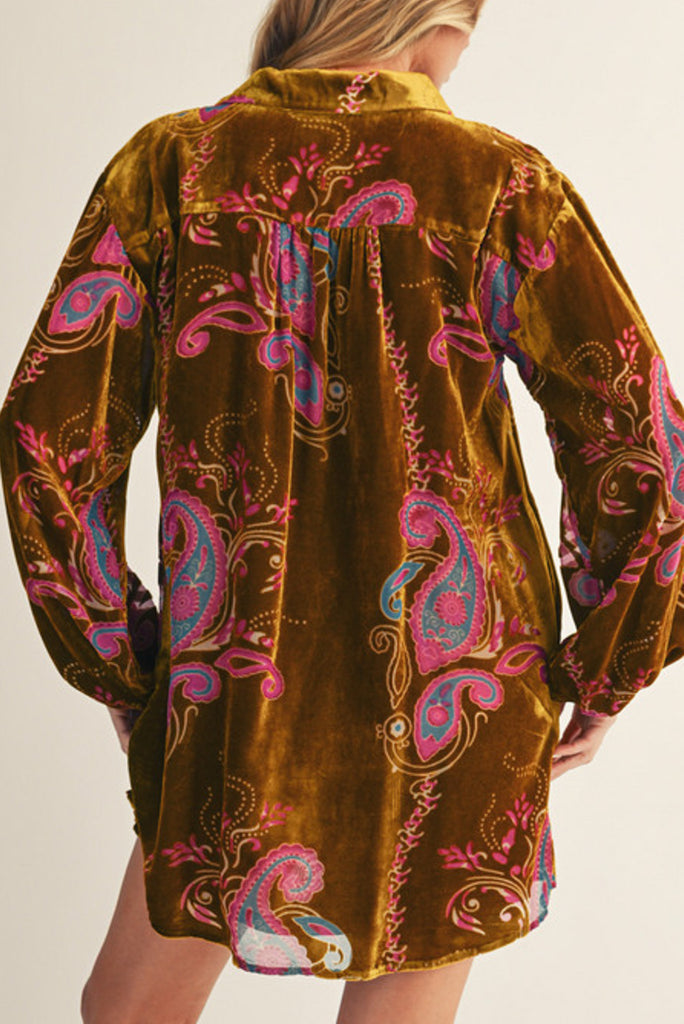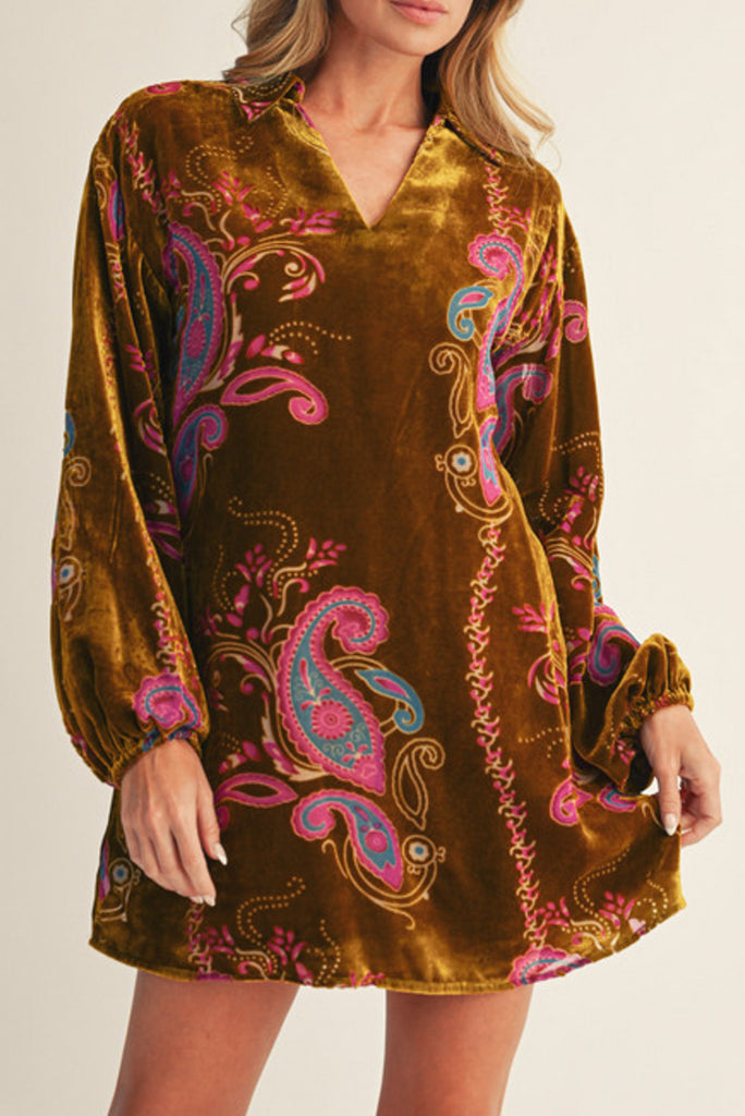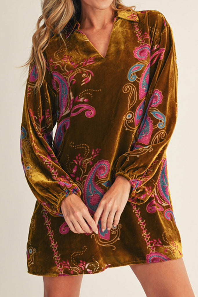 Personify Shopcute shift dress in golden olive green velvet with a colorful paisley burnout design. lined dress features a collared v neckline, roomy long sleeves with elasticated cuffs, pleated details on back, and a mini length skirt. dress can be styled as pictured or worn with tights into the holidays or with wide leg jeans as a tunic.