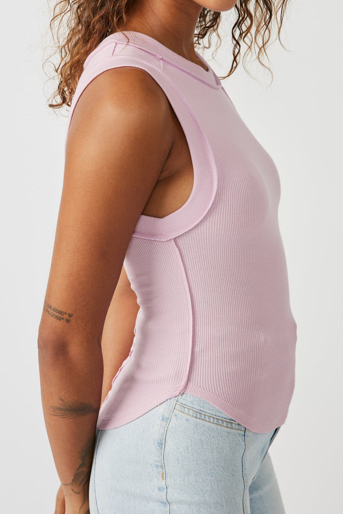 Personify Shopfree people effortless sleeveless top in pale pink. this goes-with-anything sleeveless tee features a high crew neckline, rounded bottom hem, and exposed seaming throughout for a truly lived in look. kate is a wonderful multi-season piece; layer it in winter and fall and wear it solo in spring and summer.