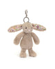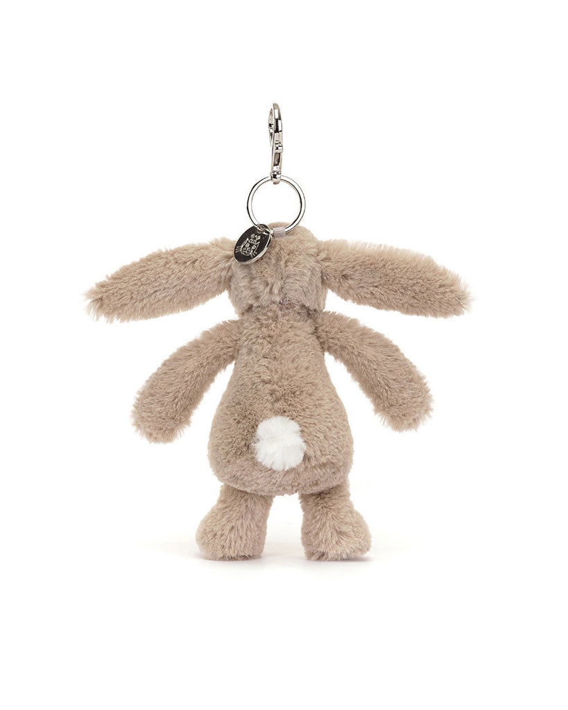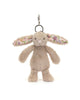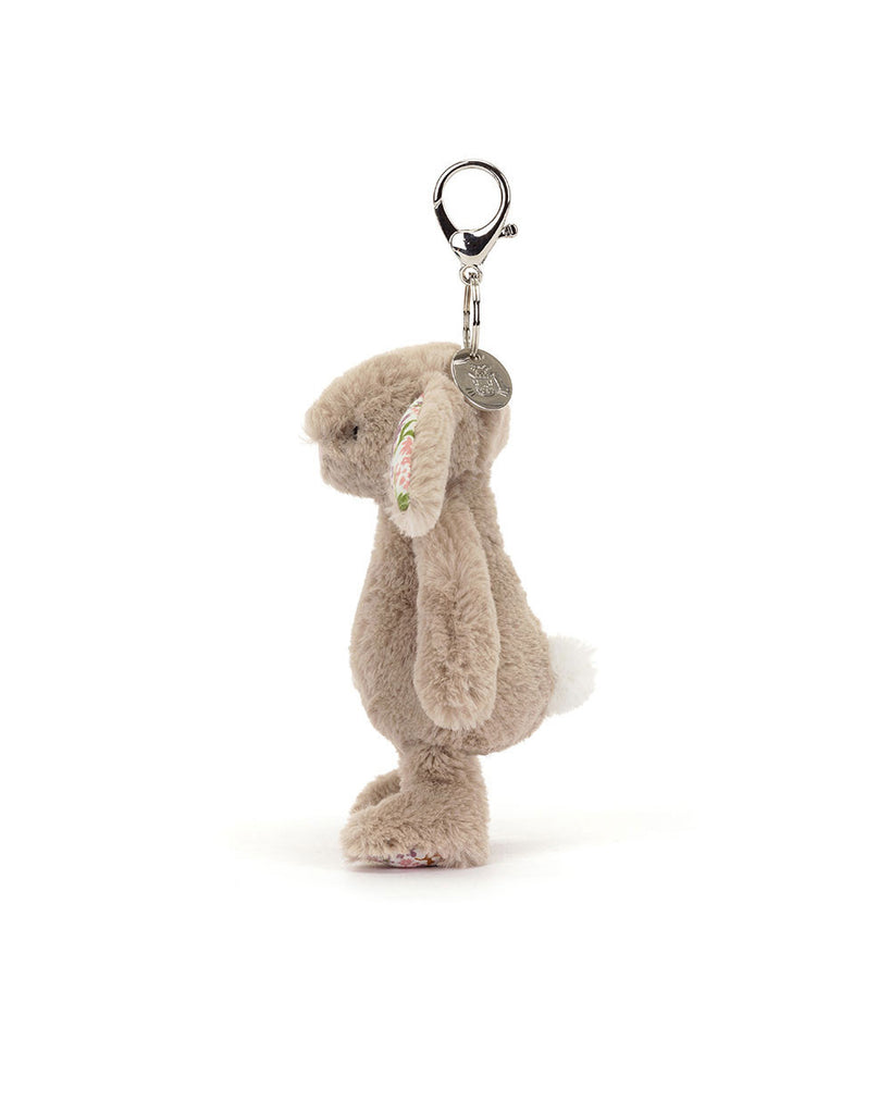 Personify Shopblossom beige bunny bag charm has brought along some special flowers to brighten your day! in iconic bashful beige fur with a cream bobtail, this pocket-sized blossom beige bunny has soft cotton floral ears, printed with an original jellycat design of pink and purple flowers. with a silver clasp to attach to any bag, this bunny brings the joy!