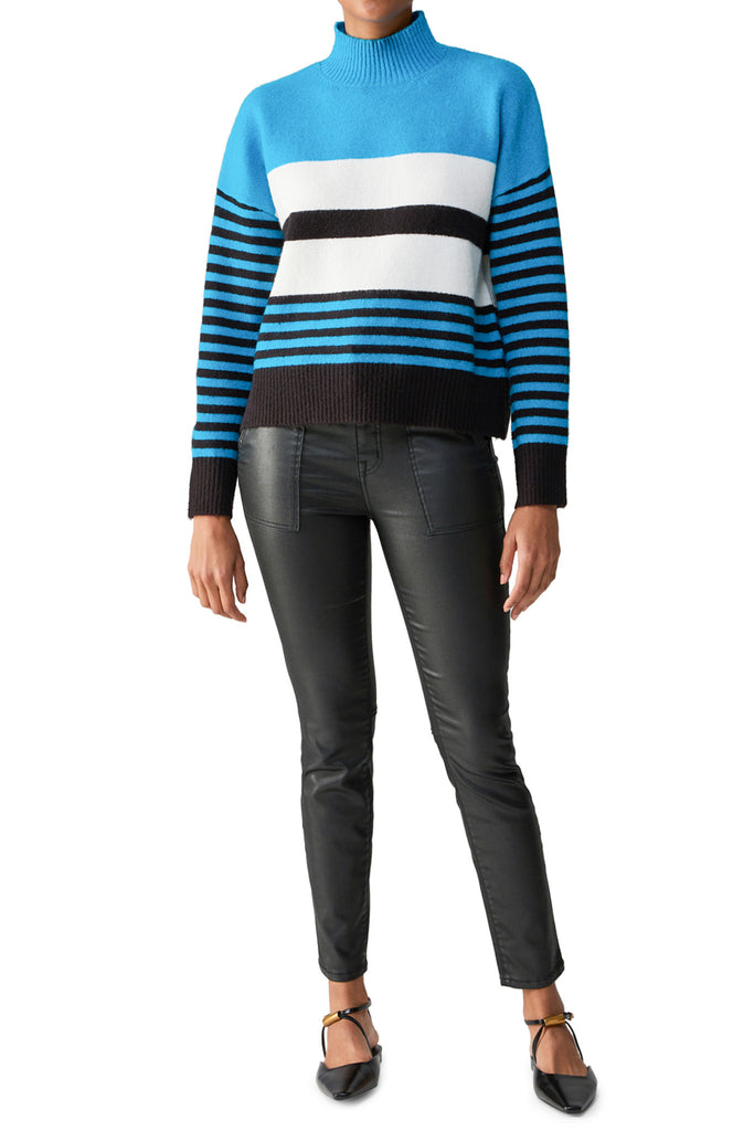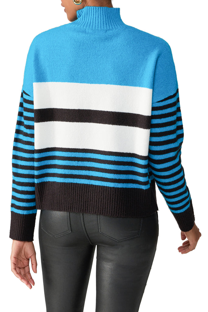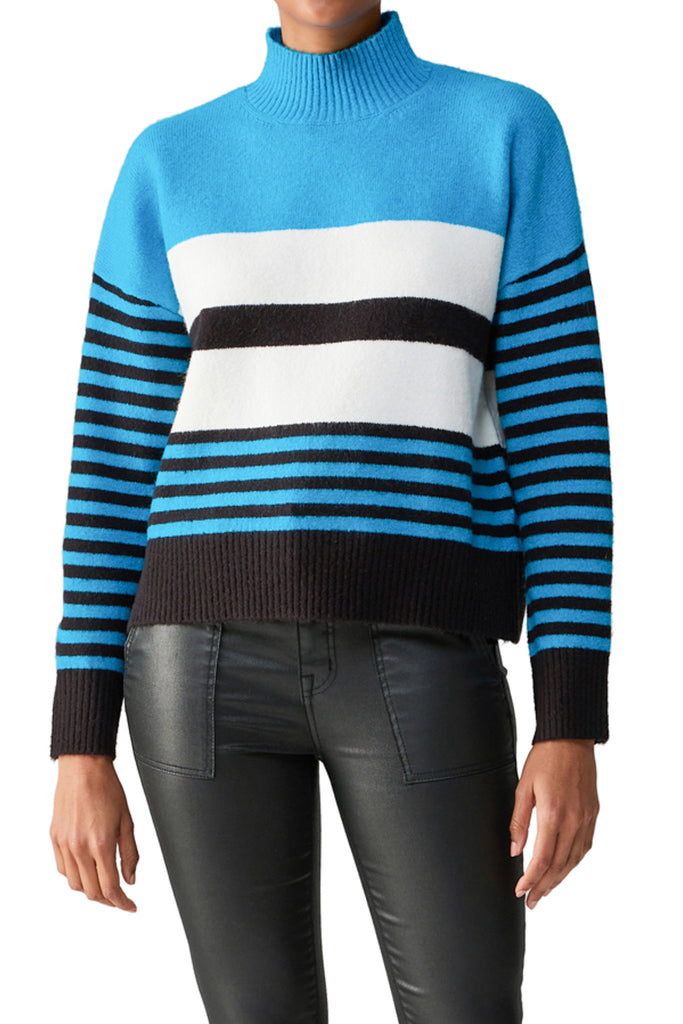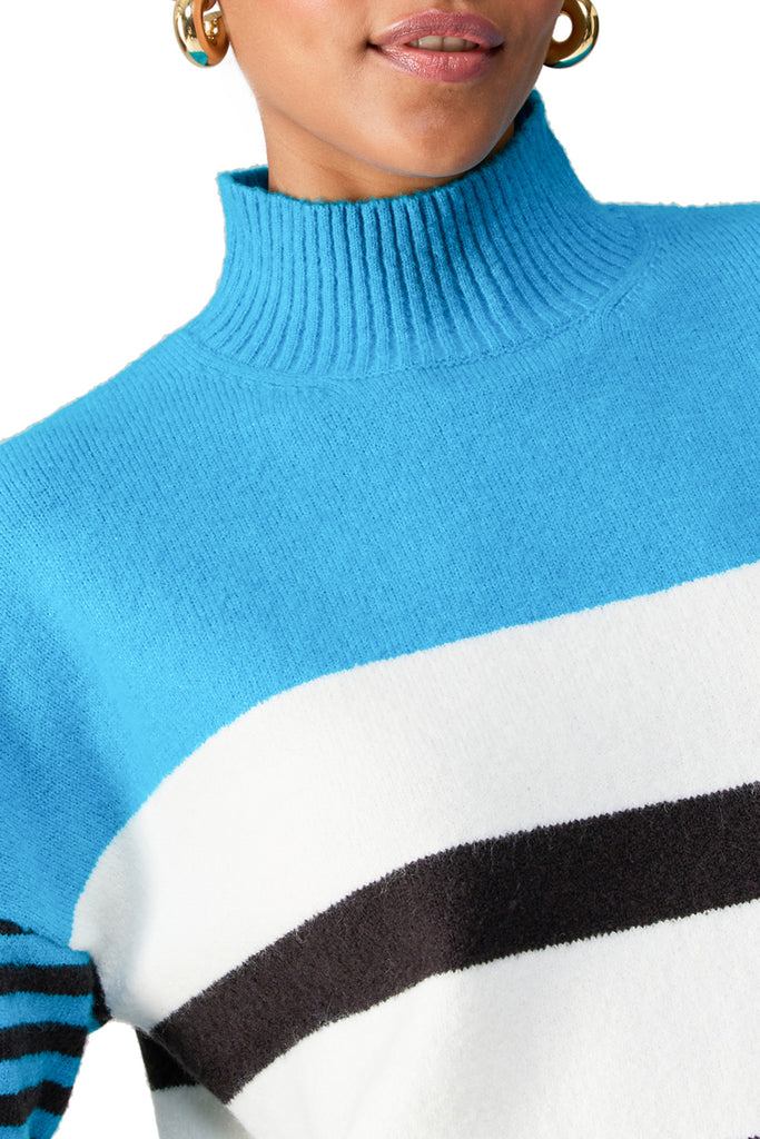 Personify Shopsoft and comfortable sweater in a cute bright blue, white, and black striped pattern. sweater features a mock neckline, dropped shoulders, roomy sleeves, and a longer length. this sweater is perfect to wear now and into the new year, and it makes a great gift!
