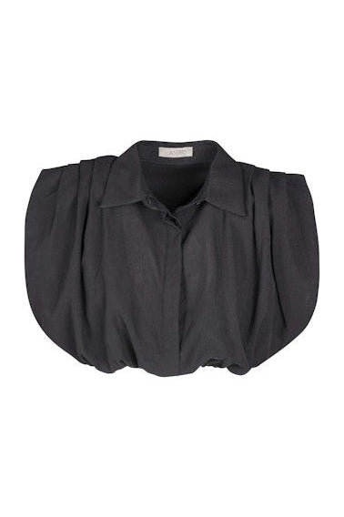 Personify Shopunique black top with a bubble hem. collared top features a button front, gathered/pleated details on shoulders, slightly cropped length, and an elasticated bottom hem, allowing for top to be pulled up or down as needed. pair with the gwen black maxi skirt for a chic, coordinated look or wear with your favorite bottoms to suit your own unique style.