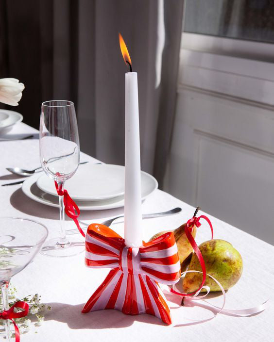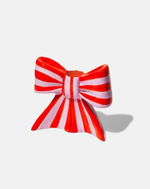 whimsical and fun candle holder. taper candle holder features a colorful pink and red striped design and a unique shape.