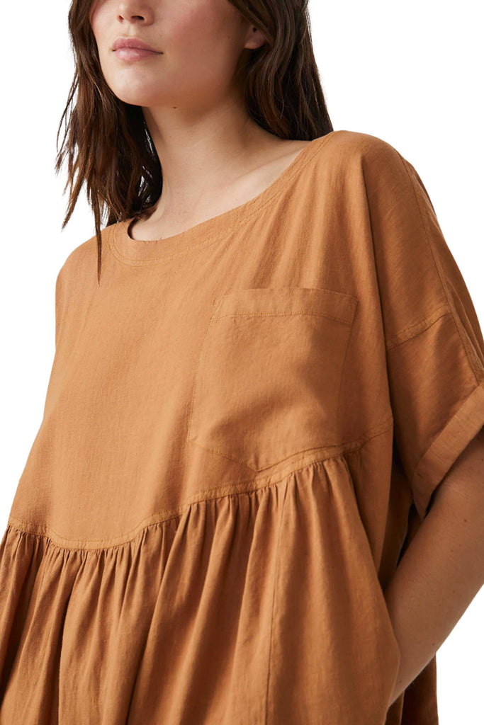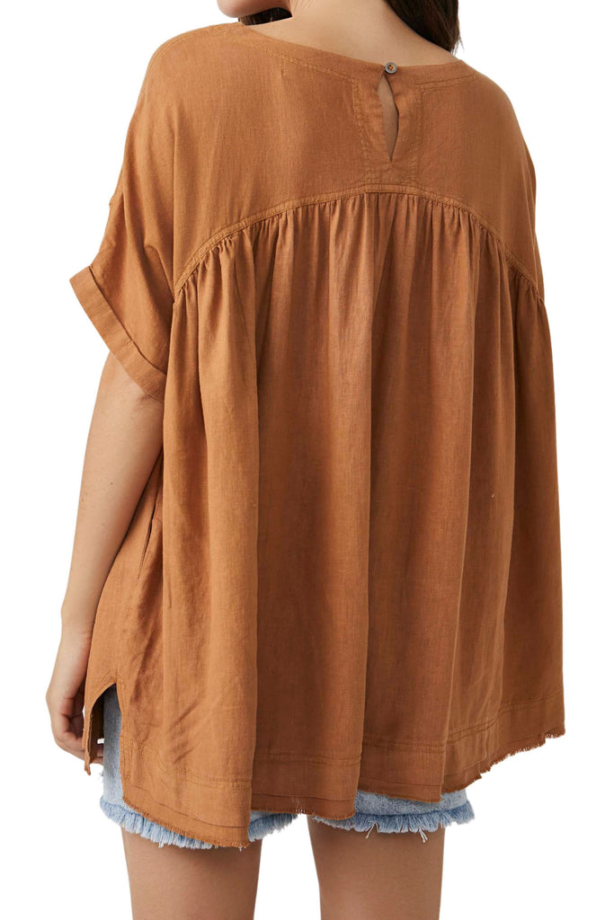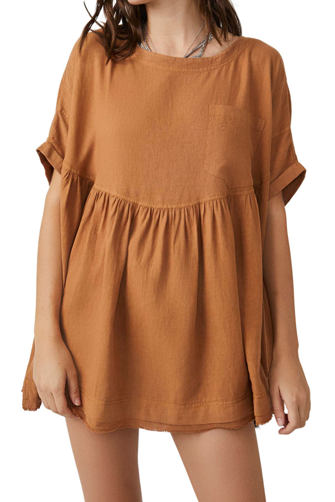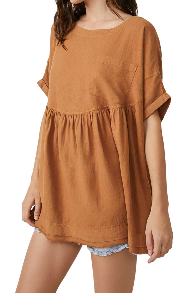 Personify Shopfree people oversized top in gorgeous warm caramel color. lightweight linen babydoll style top features a flowy body with cuffed short sleeves and front pocket. classic looking and stylish, this top is sure to become a closet staple.