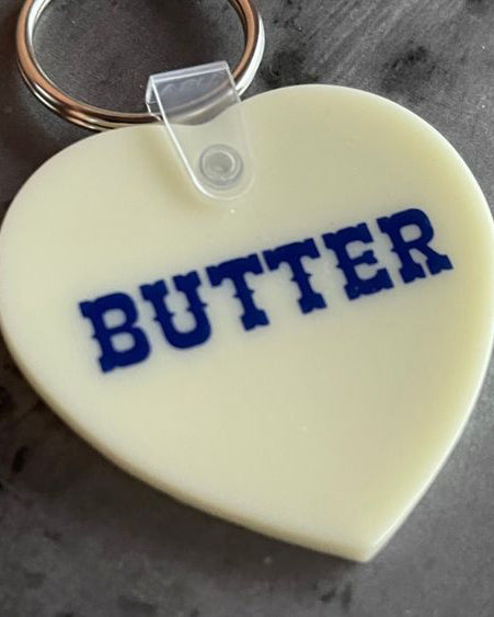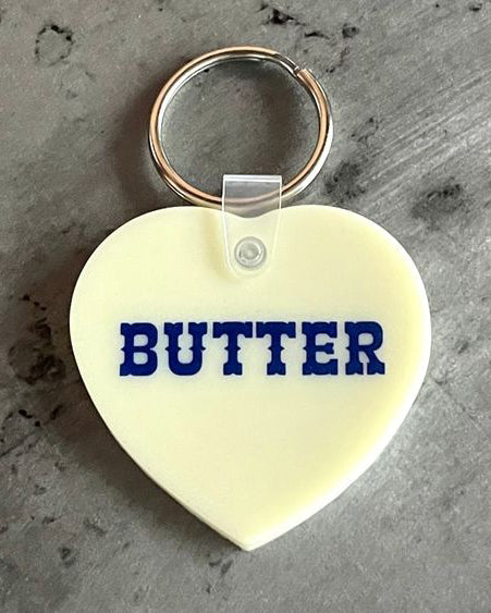 show your love for butter with this soft vinyl heart keychain. keychain comes in butter yellow and has a fun, western-inspired font.