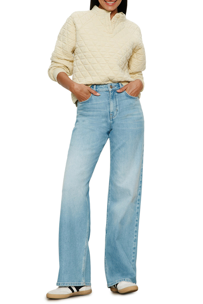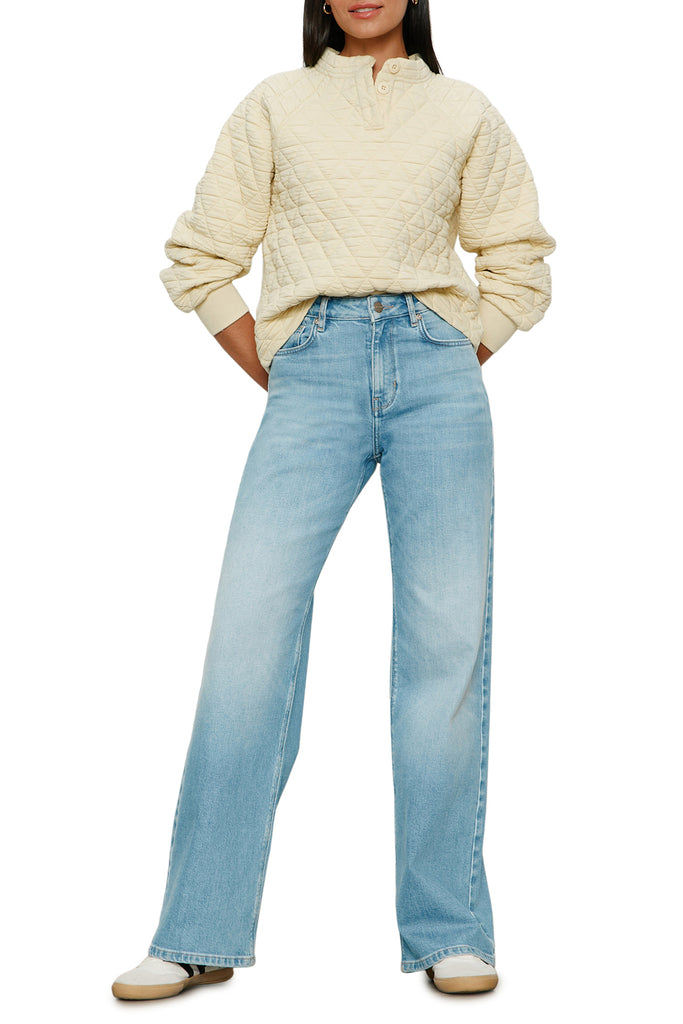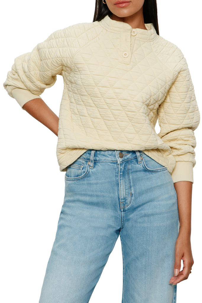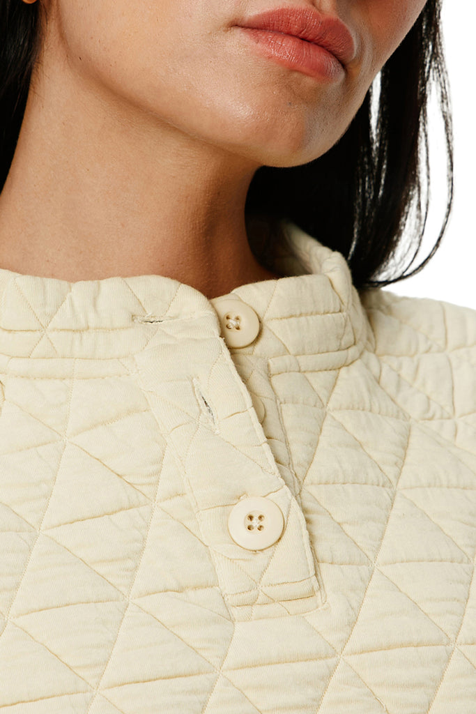 Personify Shopquilted popover in pale butter yellow. lightweight pullover features a quarter button front, high neckline, soft quilted fabrication, ribbed cuffs, and a relaxed fit. popover can be worn on its own or layered over a tank or tee. it makes a thoughtful gift!