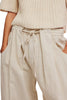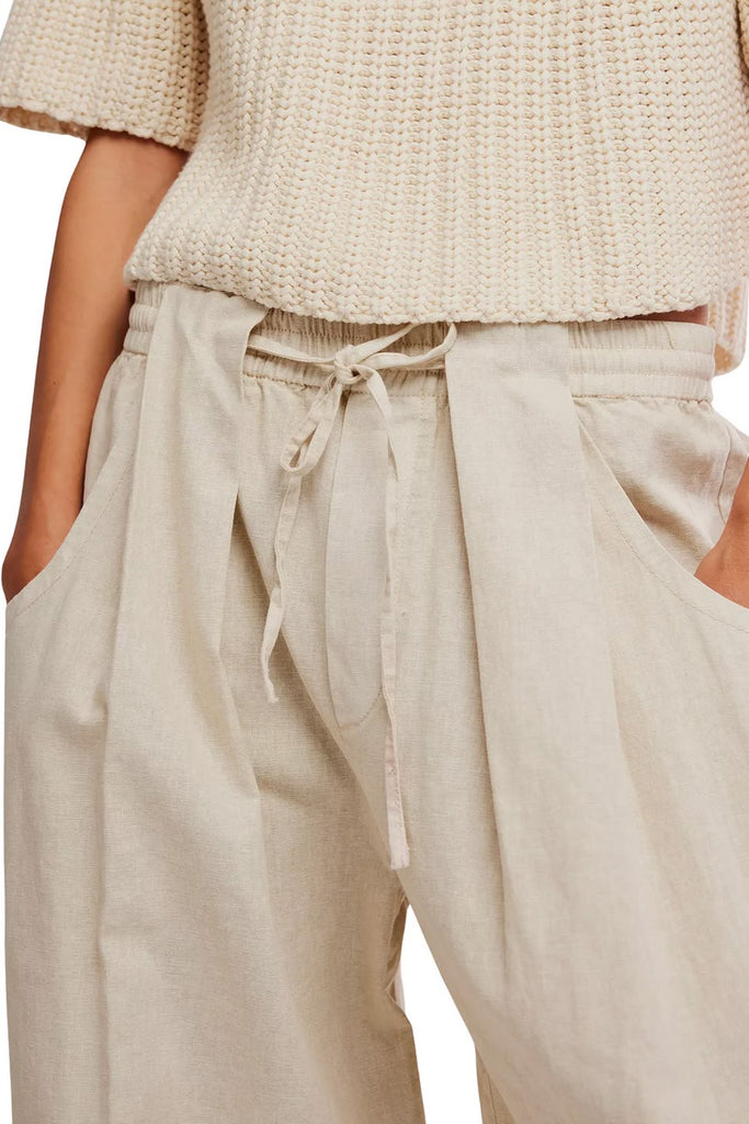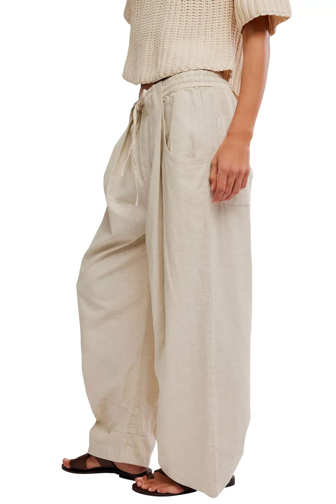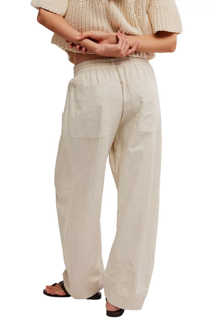 Personify Shopfree people easy and effortless pull-on pants in a beachy summer sand color. mid-rise pants have a relaxed, low-slung style and feature a breezy cotton-linen fabrication, shirred elastic waistband with drawstring, pleated details on front, roomy side pockets, back patch pockets, and a wide, slightly barreled silhouette. lightweight pants are perfect casual pants to wear this spring and bring into the summer and fall.