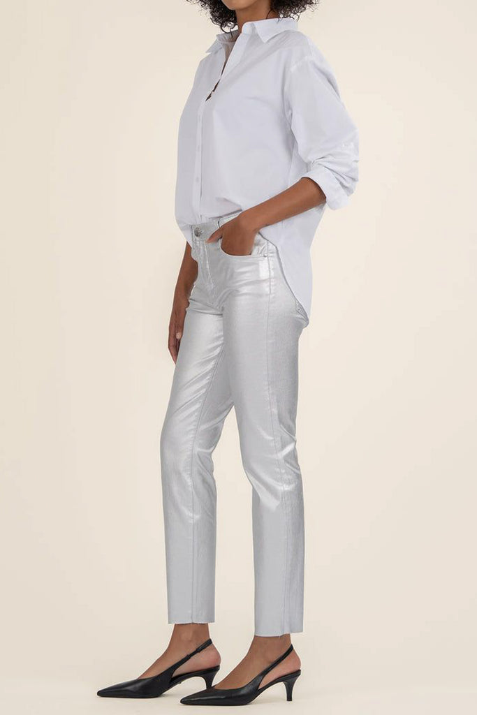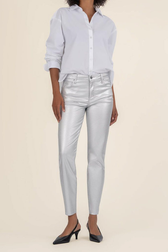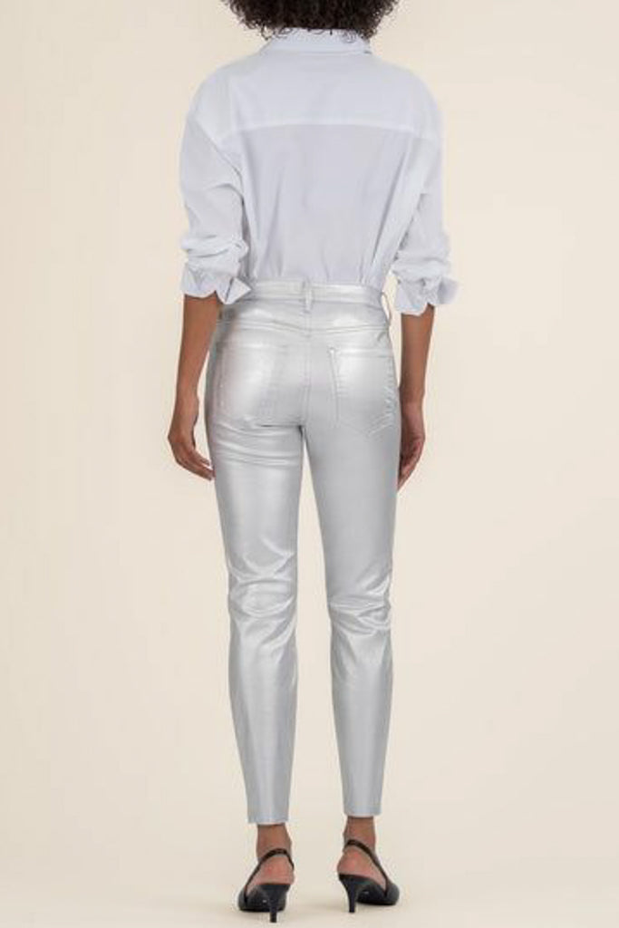 Personify Shopelevate your holiday style with these special coated jeans in festive silver. slightly stretchy jeans feature a high rise fit, smoothing fab ab pockets, and a sleek cigarette leg with a raw edge hem. jeans have an edgy, yet merry vibe that is perfect for holiday parties or special date nights.