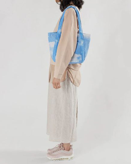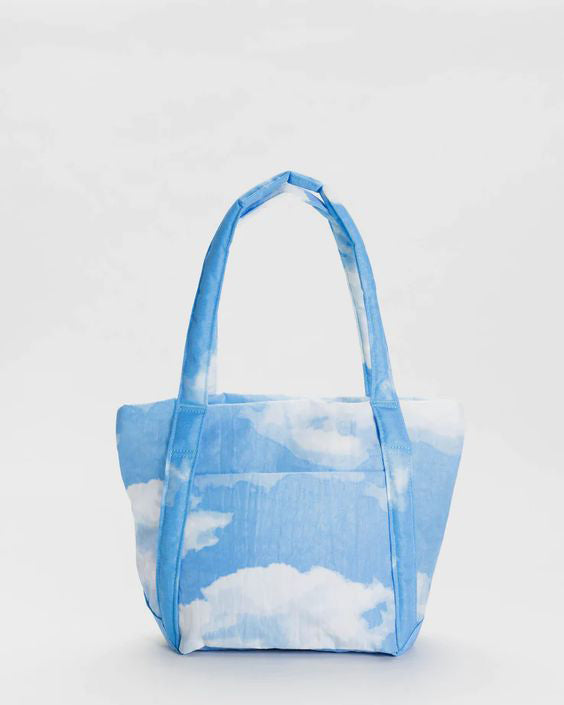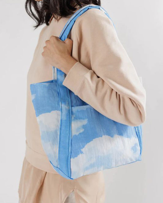 Personify Shopa purse-sized version of baggu's original cloud bag. bag is light as a feather and can pack into its own pouch for easy storage (see last picture for visual reference). bag is perfect for travel or everyday use and features a summery blue and white clouds pattern.
