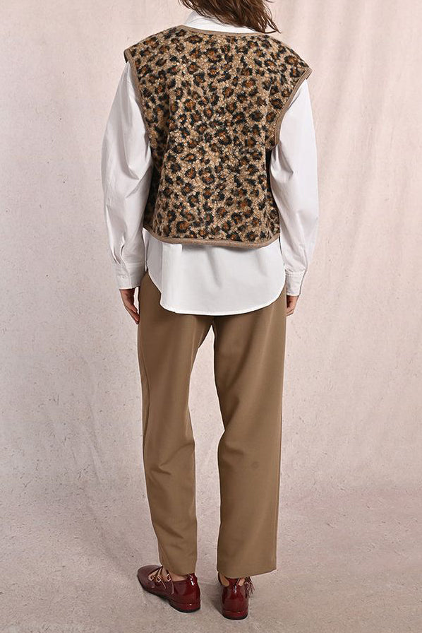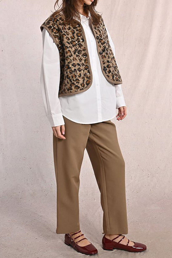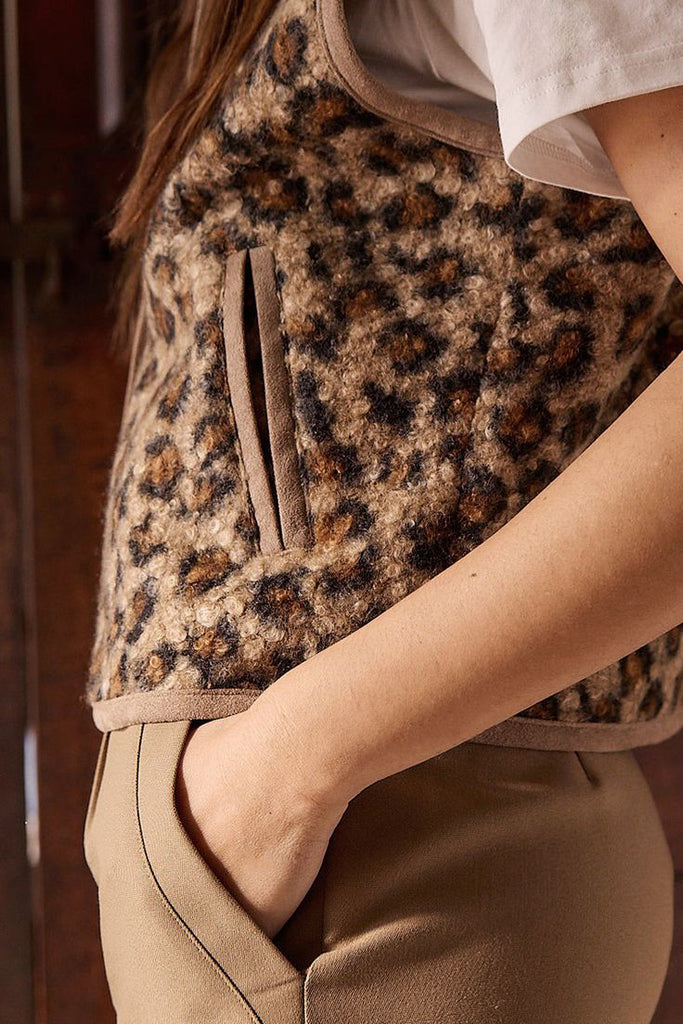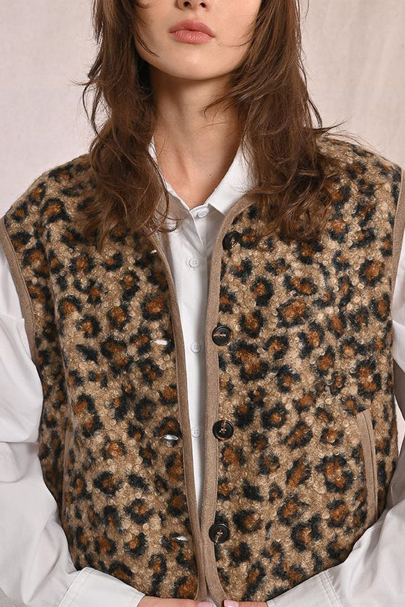 Personify Shopwarm, cozy vest in a fierce and trendy leopard print. lined vest is made from a soft, textured fleece and features a round neckline, button front, side welt pockets, and a straight, oversized fit. it makes a cute layer to wear all winter long.