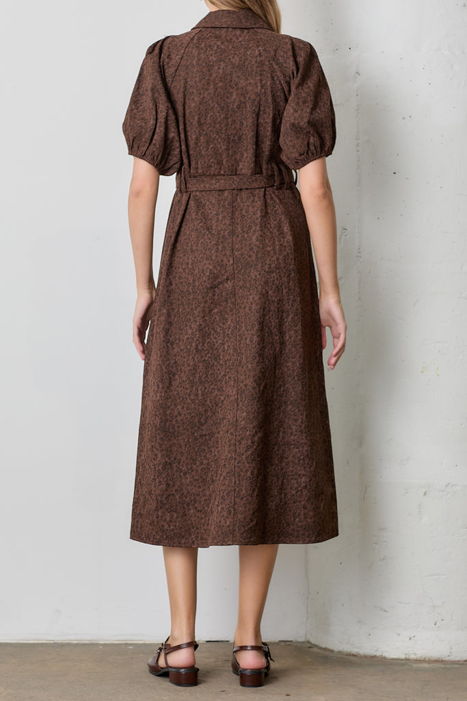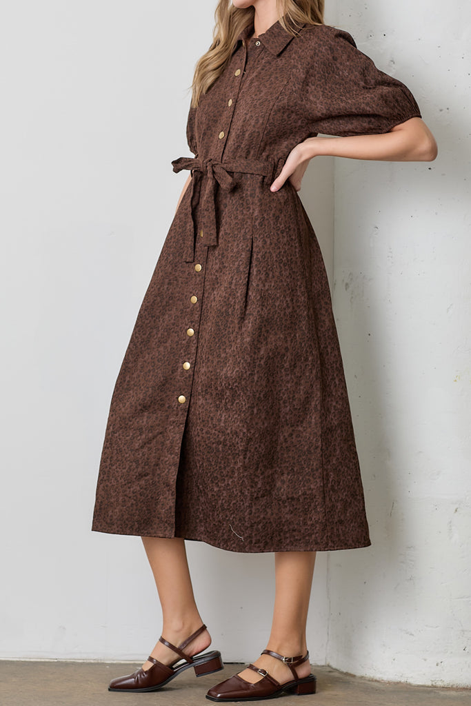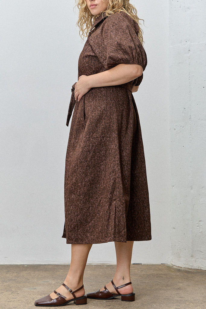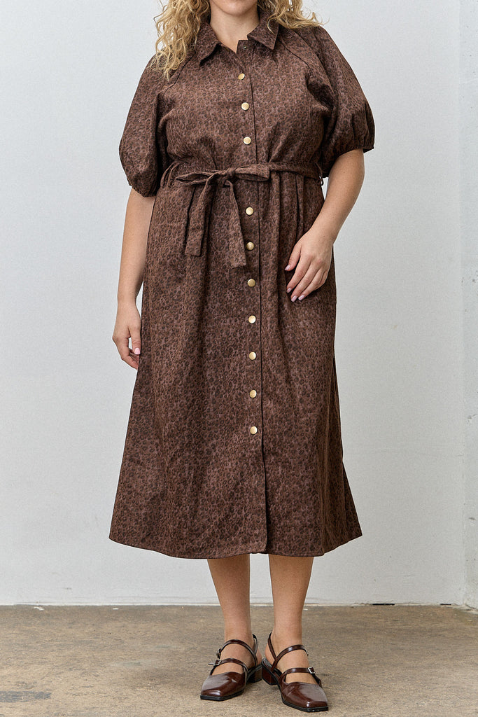 Personify Shopcute denim shirt dress in a red-hued brown leopard print. easy to wear dress features a collared neckline, snap front, roomy puff sleeves, adjustable belt tie, and side pockets. dress runs small in the bust, so we recommend sizing up if you are busty. dress is available in an inclusive size range.