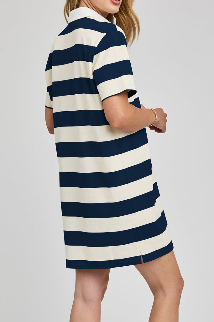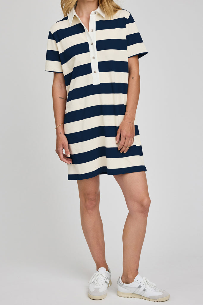 Personify Shopcomfortable cotton jersey mini dress in navy blue and white rugby stripes. sporty dress has a relaxed fit and features a contrast collar, half placket button closure, and side slits. dress can be paired with sneakers or sandals for an elevated casual look this spring and summer.