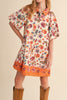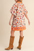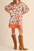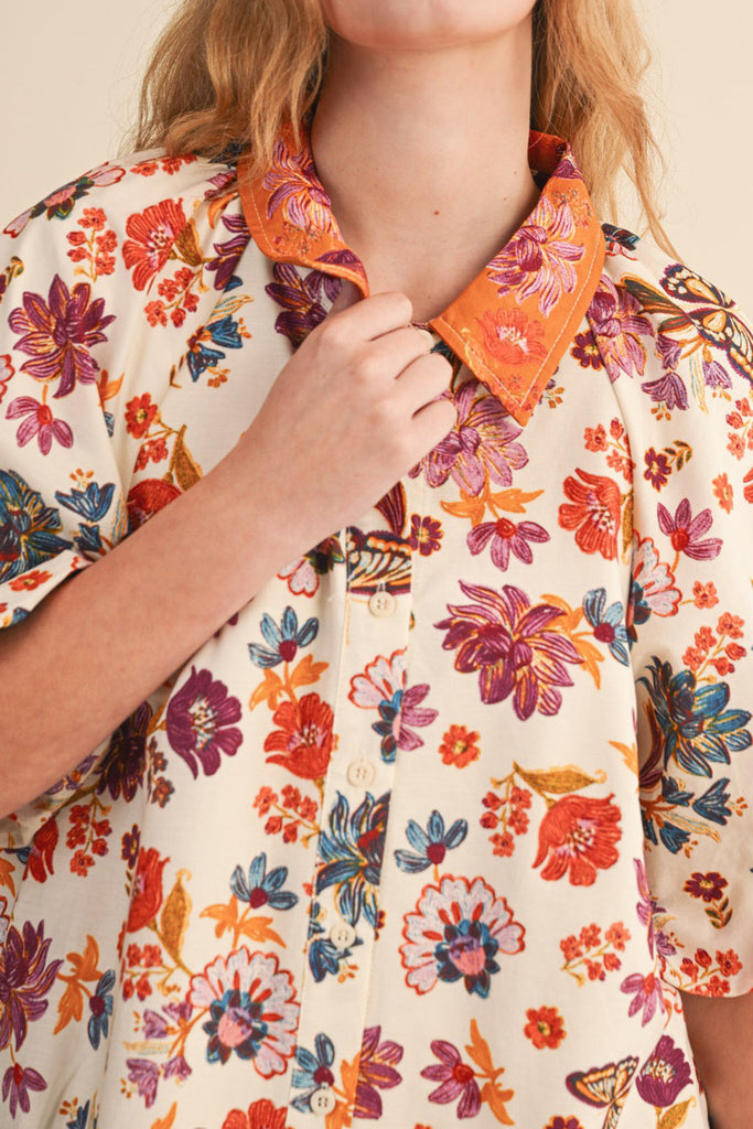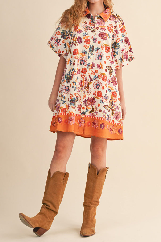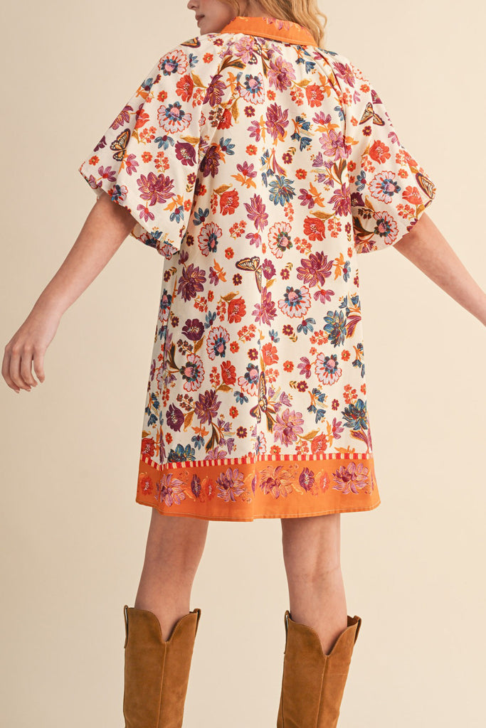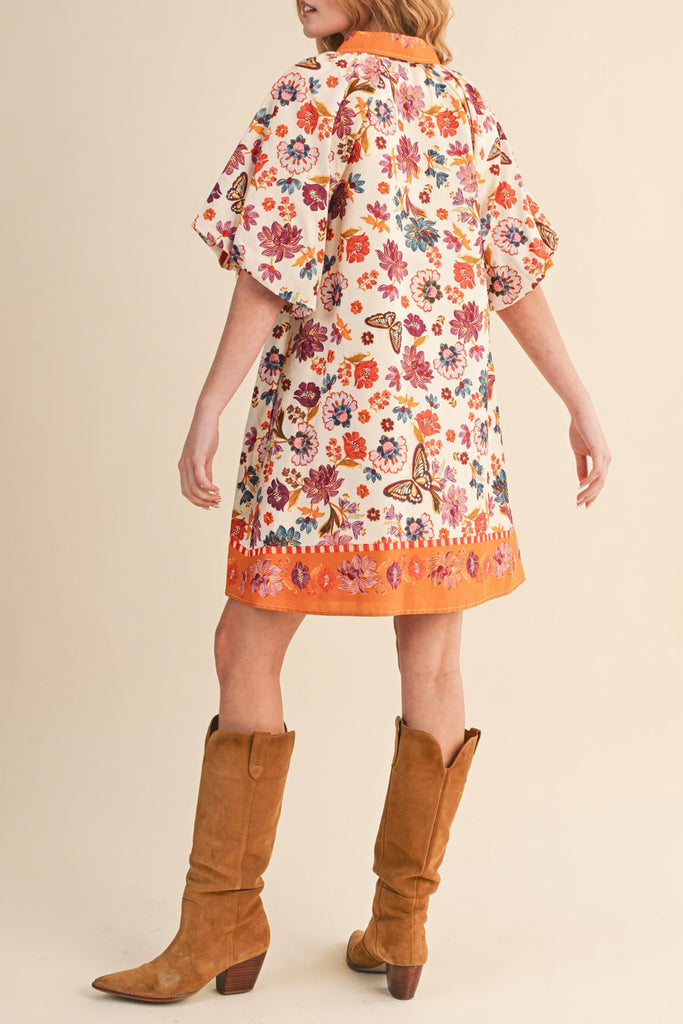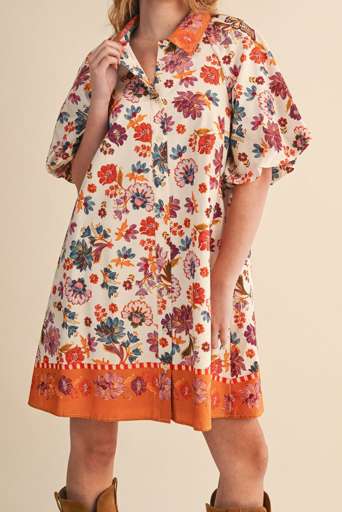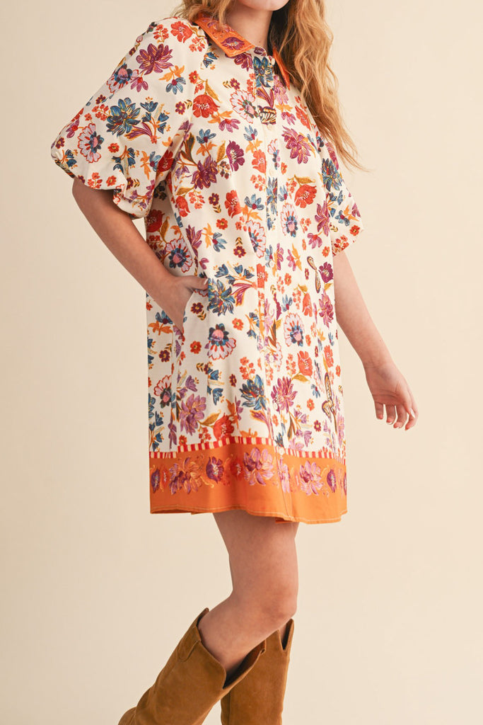 Personify Shopeasy to wear shirt dress in a gorgeous floral pattern. lined dress features a coordinating orange collar, fully functional button front, short puff sleeves, side pockets, and a relaxed shift shape. dress is perfect to wear in the fall, but can also easily be worn again in the spring. dress runs true to size.