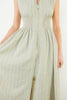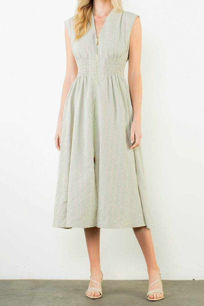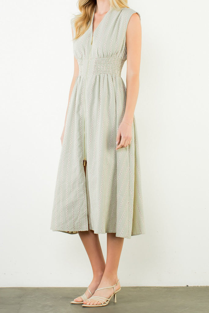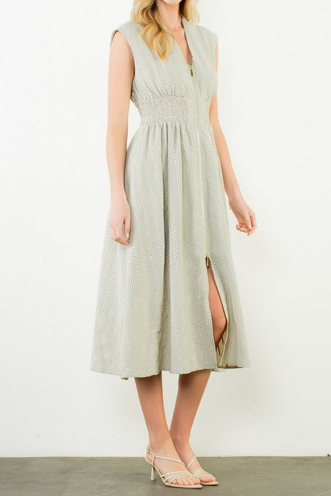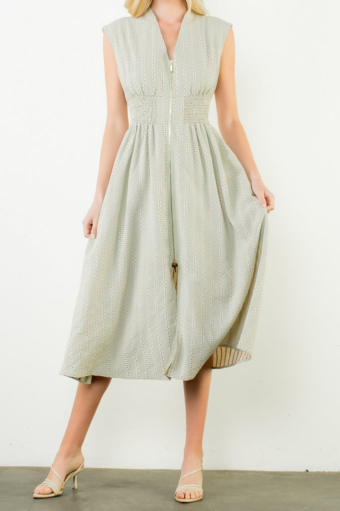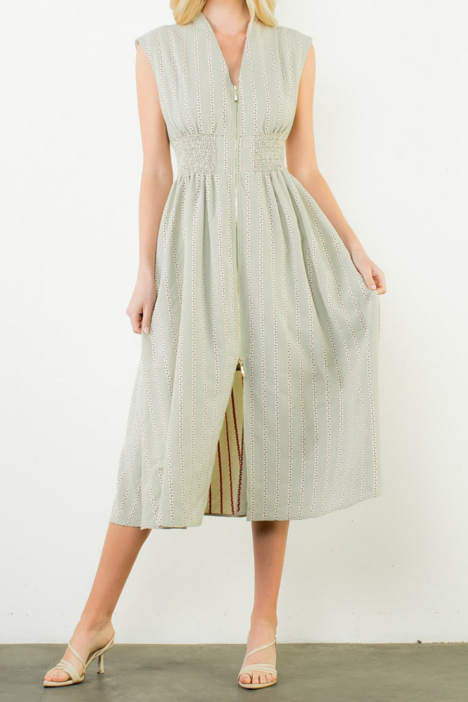 Personify Shopgorgeous midi dress in a pretty striped material with floral details. lined dress has a sleeveless silhouette and features a v neckline, zippered front, smocked waist, side pockets, and a full midi skirt with front slit. dress makes a wonderful option for easter and other special events this spring.