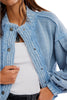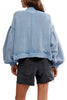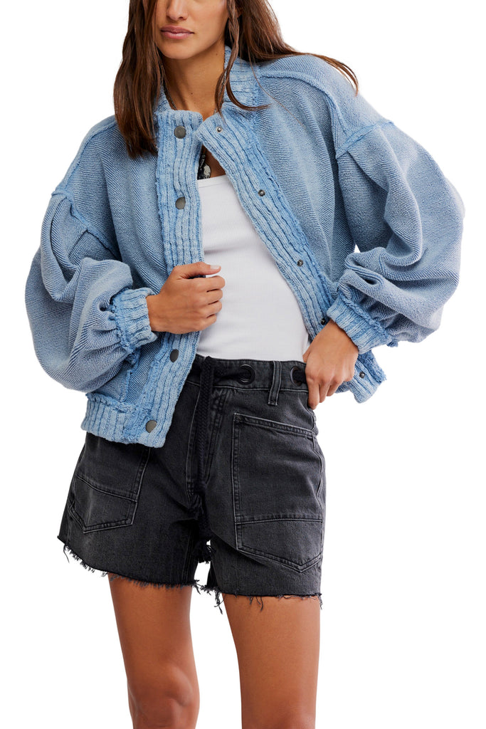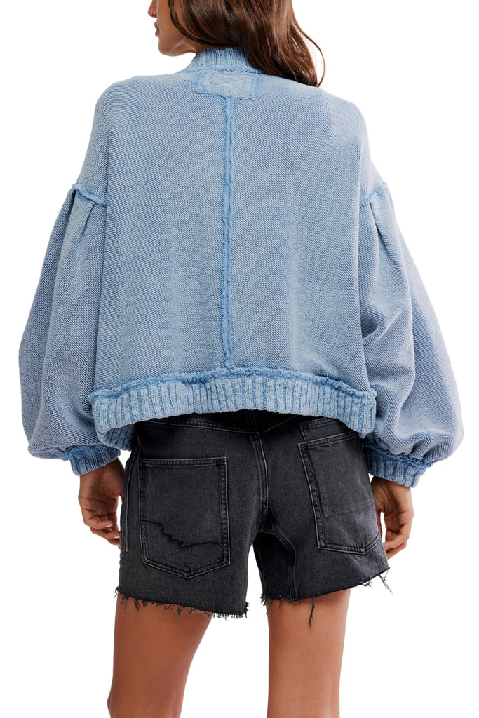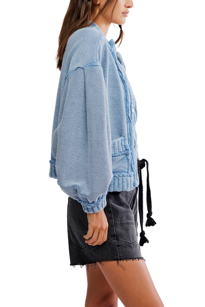 Personify Shopfree people cozy and soft terry cardigan in dusty sky blue. cardigan's weight is similar to that of a jacket, as it is made from a thicker knit material. sweater has a slouchy, oversized fit and features a crew neckline, dropped shoulders, roomy long sleeves with cuffs, snap closures, ribbed knit trim, front patch pockets, and defined seams throughout. comfortable cardigan is perfect to throw on over your favorite tees or tanks or to wear as a jacket this fall.
