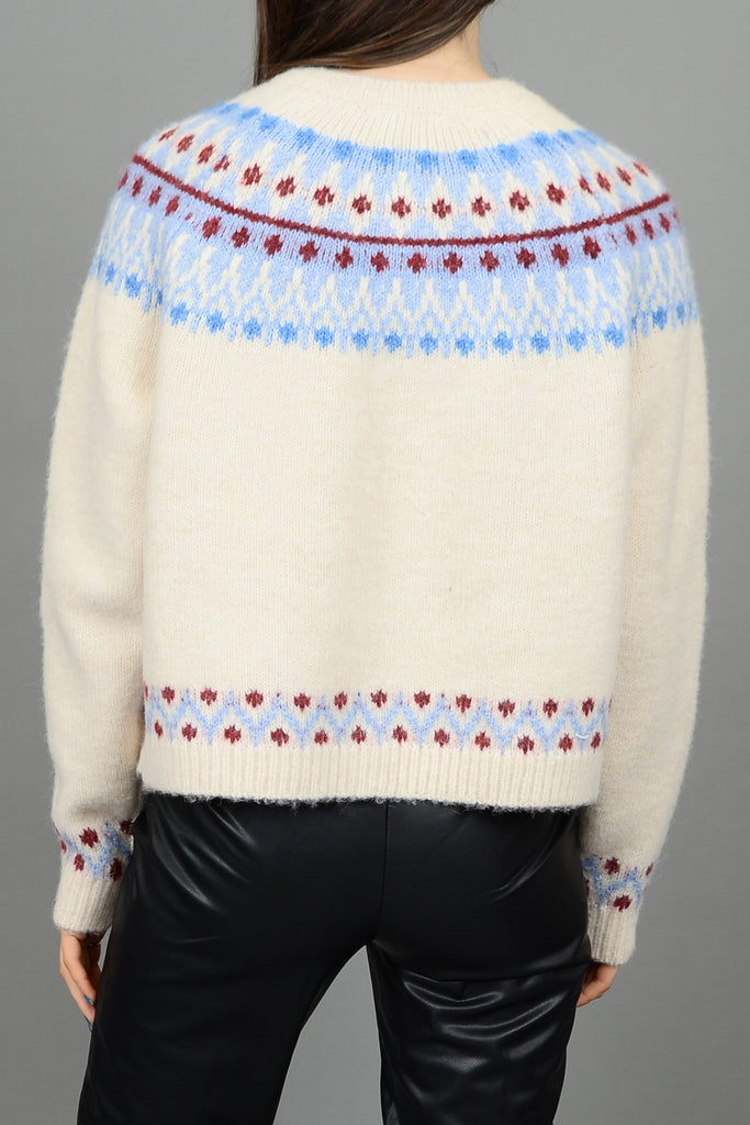Personify Shopsweet white cardigan with a beautifully knit fair isle yoke in burgundy, turquoise, and baby blue. relaxed fit cardigan features a crew neckline, white button front, and roomy long sleeves. soft cardigan has a nice fit and makes a wonderful layer to wear as fall turns into winter.
