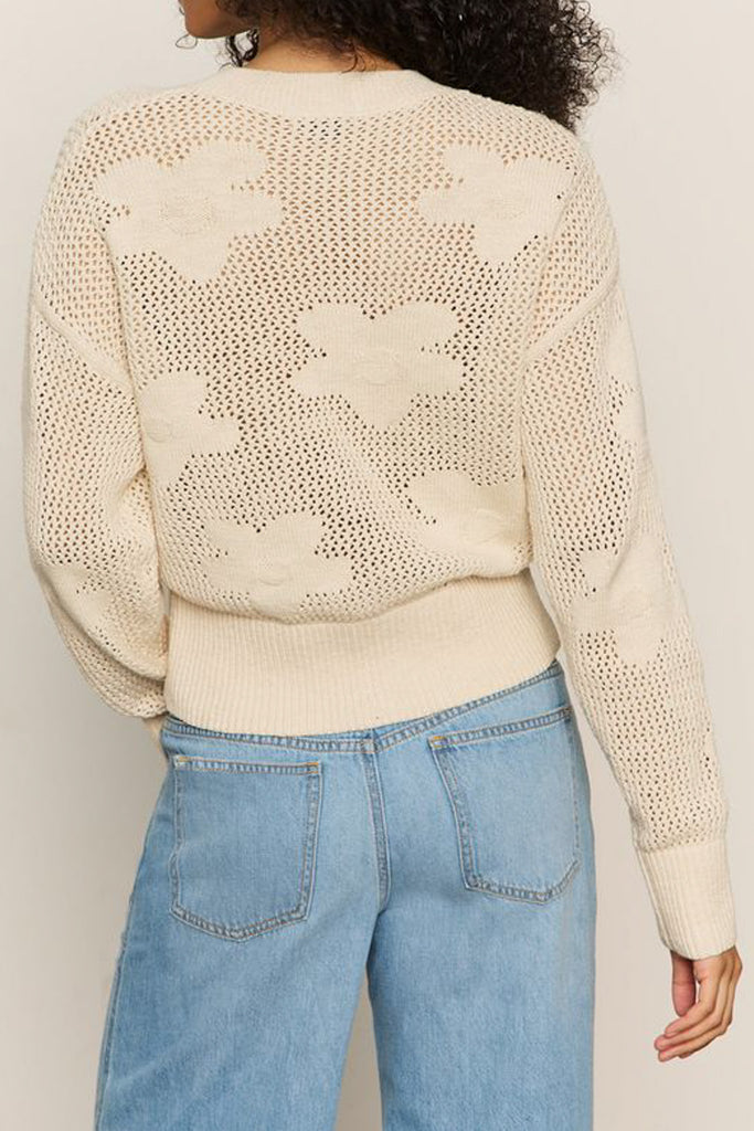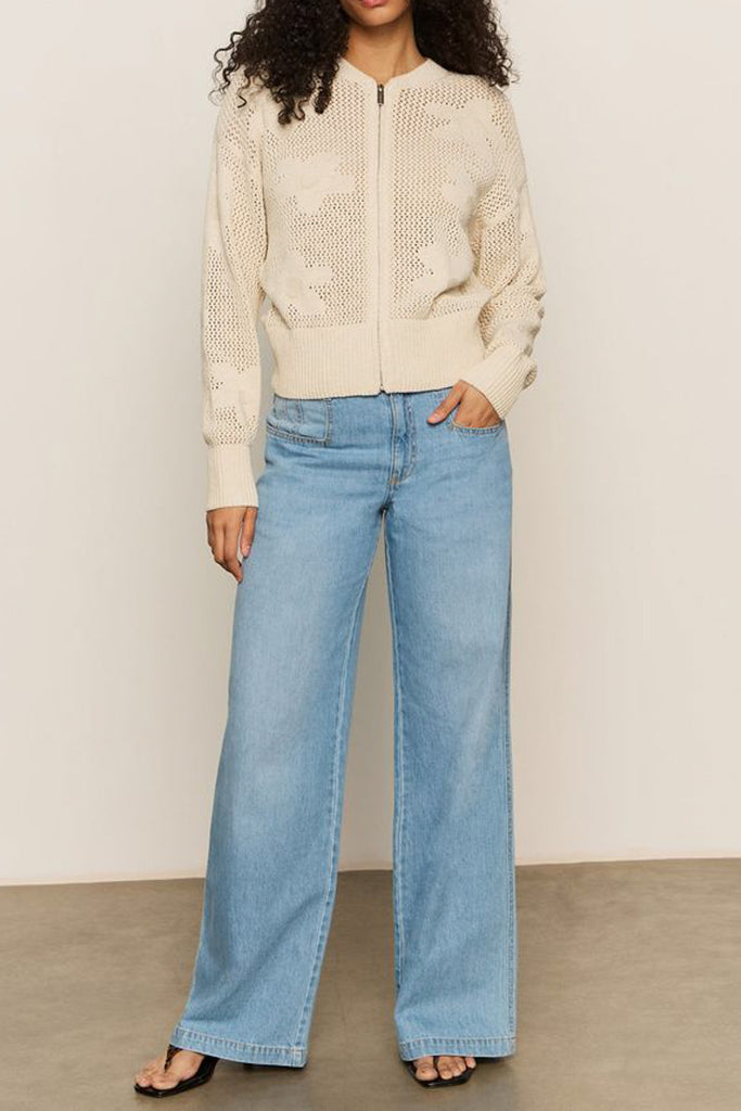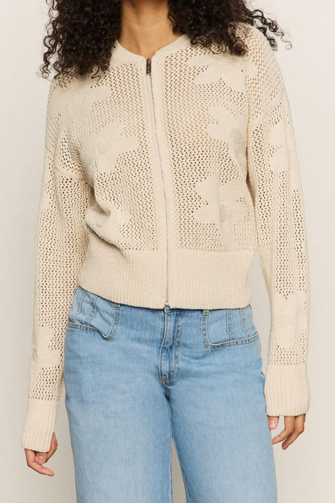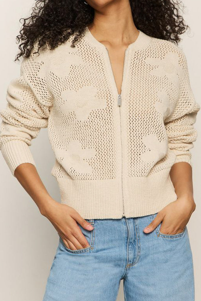 Personify Shoplightweight open knit jacket with a fun flower design. bomber-style jacket features a zip front, flower details, ribbed knit hems/cuffs, and a relaxed fit. jacket is cute, versatile, and perfect to wear now and into the fall.