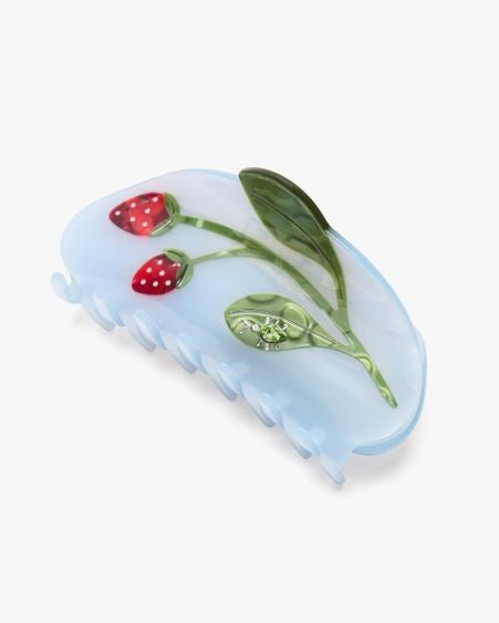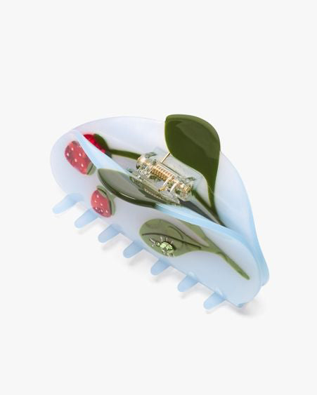Personify Shopa summer drive up a winding mountain road takes a brief aside when you spot a lush growth of berries. you fill your pockets with handfuls of deep crimson wild strawberries, small but perfectly ripe. hair claw's design is made for reminiscing about aimless days and warm nights. large claw features a sprig of strawberries, dew soaked leaves, and a small rhinestone beetle- as if plucked straight from a cool, pine shaded forest.