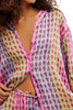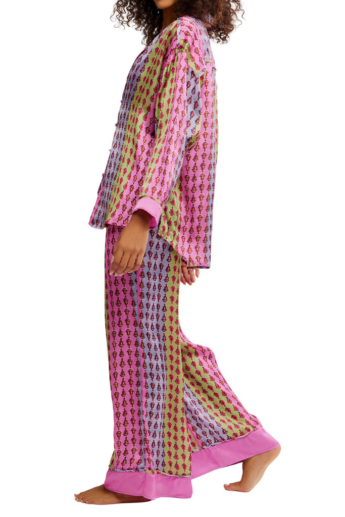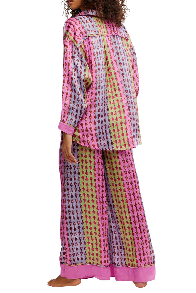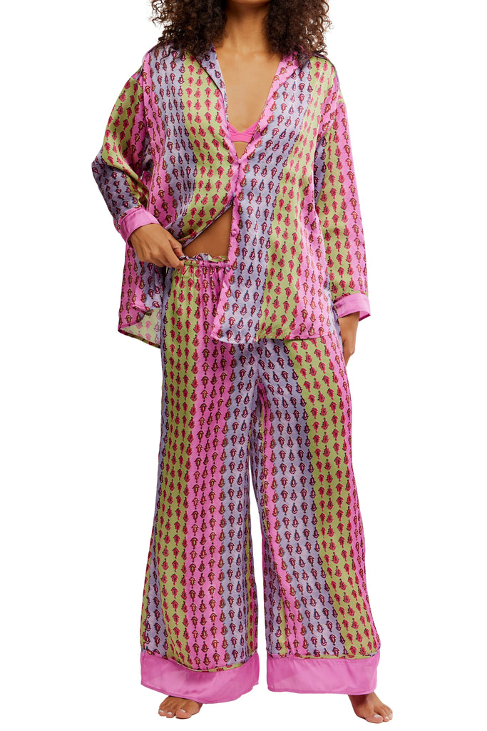 Personify Shopfree people beloved pajama set in a colorful stripe print. silky pajamas feature wide legs pants with a relaxed fit and a roomy button down top. top and bottoms both have coordinating cuffs and hems in pretty purple. both pieces run on the larger side, so size down for a less oversized fit. note: pajamas' material does not stretch. wear set as pajamas or separate the pieces to wear out and about. this set makes a wonderful gift!