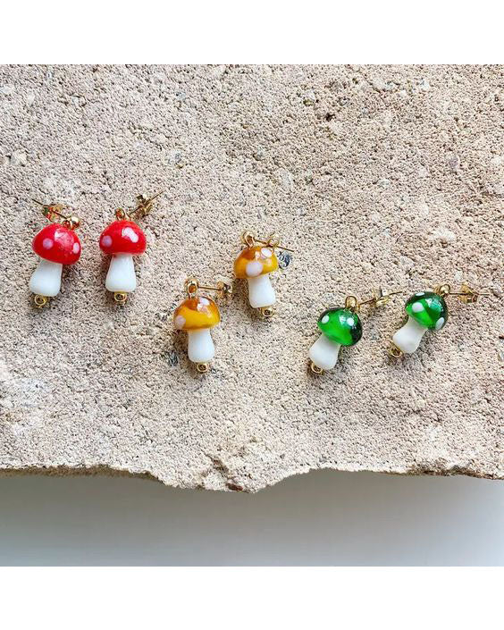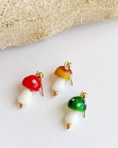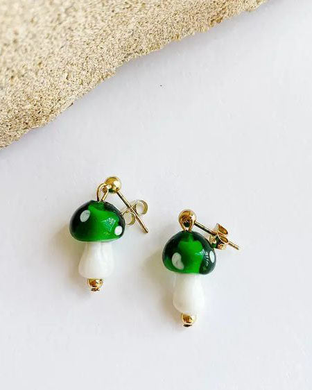 cute-as-can-be dangle earrings featuring green and white glass mushrooms. earrings are also available in red and amber.