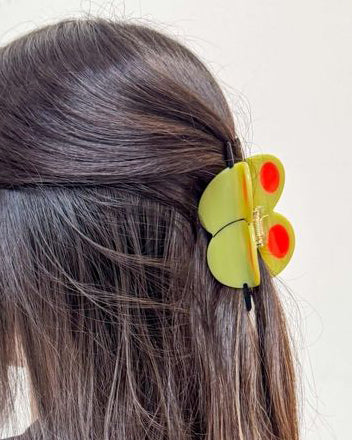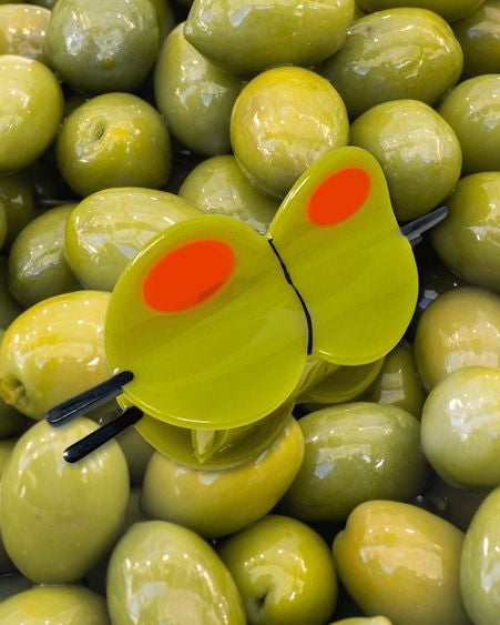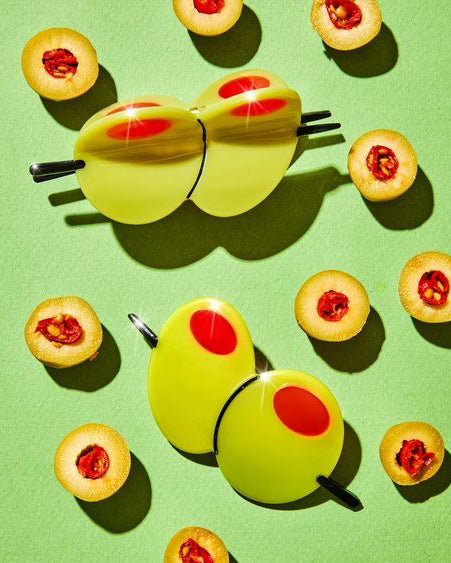Personify Shopolive your hair dreams coming true! featuring two martini olives on a toothpick with bright red pimento details, this playful hair claw is perfect for cocktail enthusiasts and olive lovers alike. this large hair claw is made from cellulose acetate, a plant-based and environmentally-friendly alternative to plastic. this colorful and unique claw is sure to add some fun to any outfit.