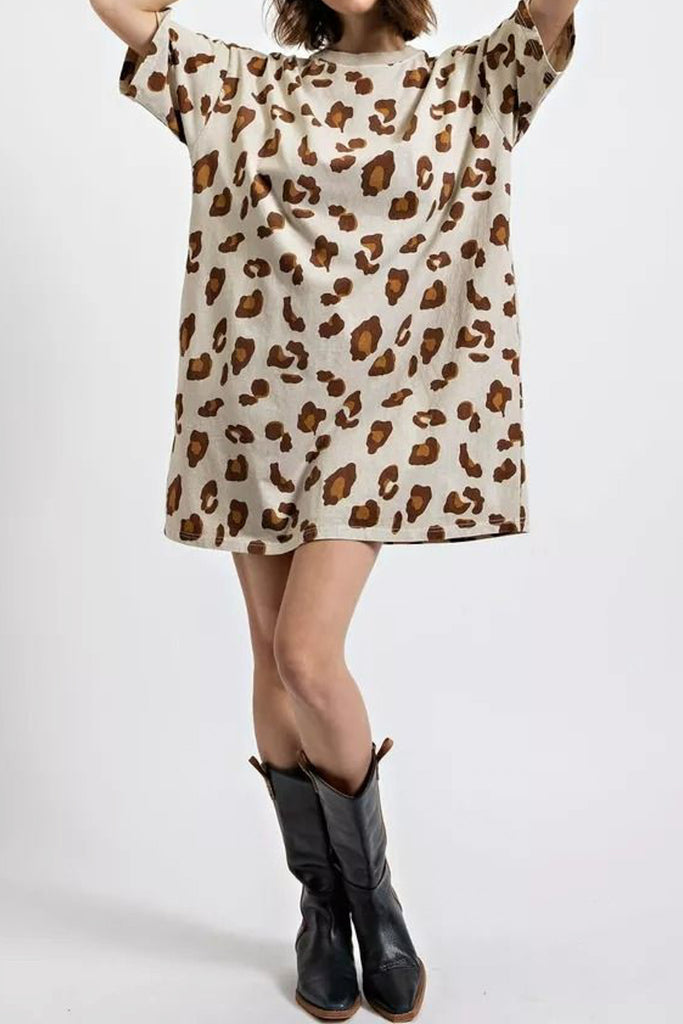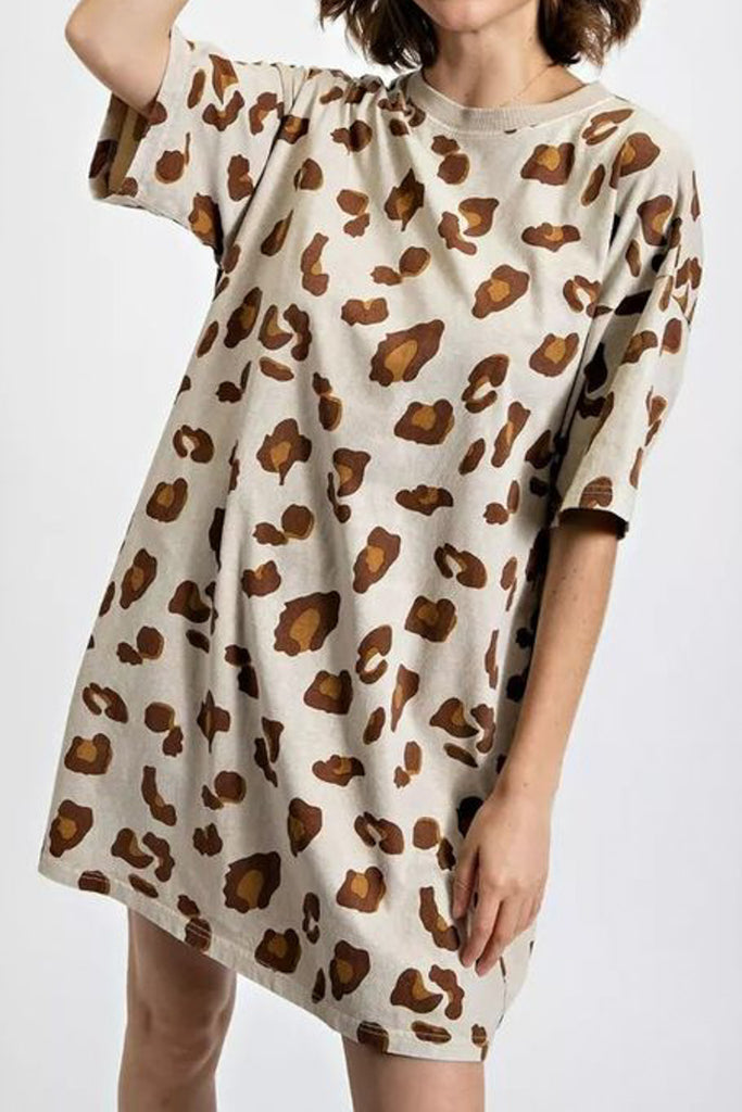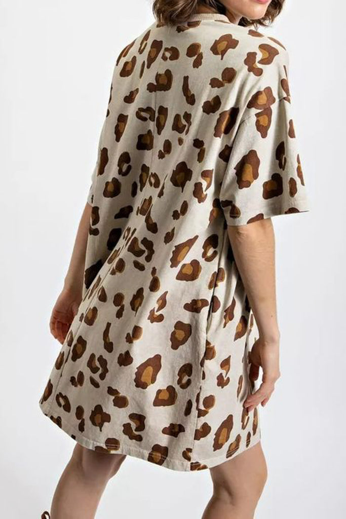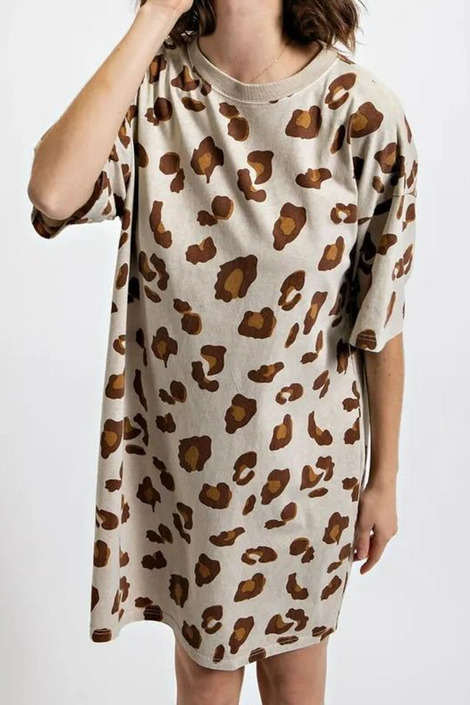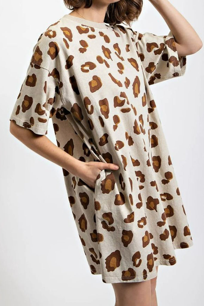 Personify Shopmineral washed khaki t-shirt dress with a bold leopard print. dress has a loose, boxy fit and features a crew neckline, dropped shoulder short sleeves, side pockets, and a mini length. dress is an easy to wear and casual piece for summer, perfect to throw on for a day at the beach or pool. dress is also available in periwinkle blue and pineapple.