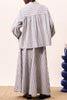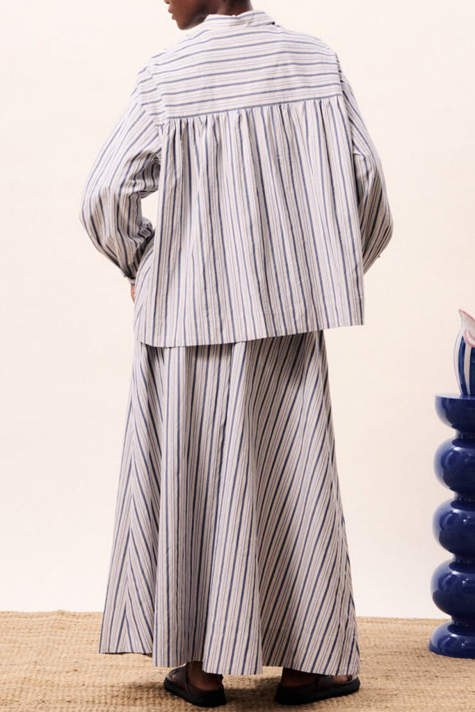 Personify Shopfashion forward button down top in soft blue vertical stripes. lightweight cotton top has an oversized, billowy fit and features a petite collar, button front with covered placket, dropped shoulders and extra roomy long sleeves. pair with the kailani skirt for the cool, coordinated look pictured here or pair it with your favorite jeans or shorts for springy look.