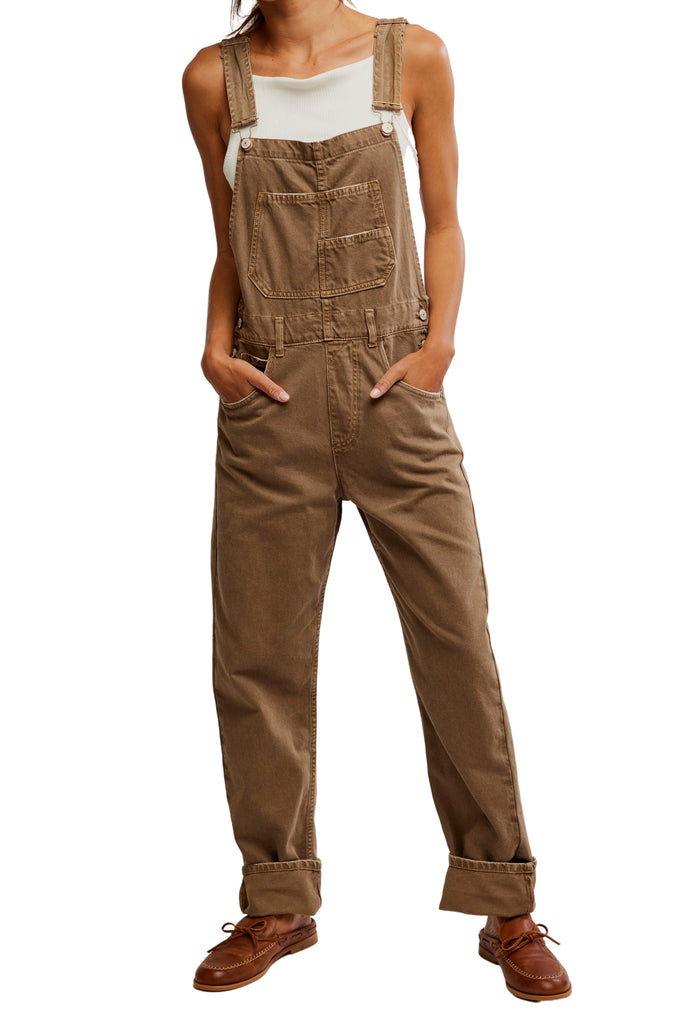 Personify Shopfree people classic overalls in a unique, western-inspired light brown. these perfect, fan favorite overalls feature a relaxed, slouchy silhouette with tapered legs and exaggerated pocket details for added dimension. overalls run true to size.