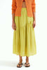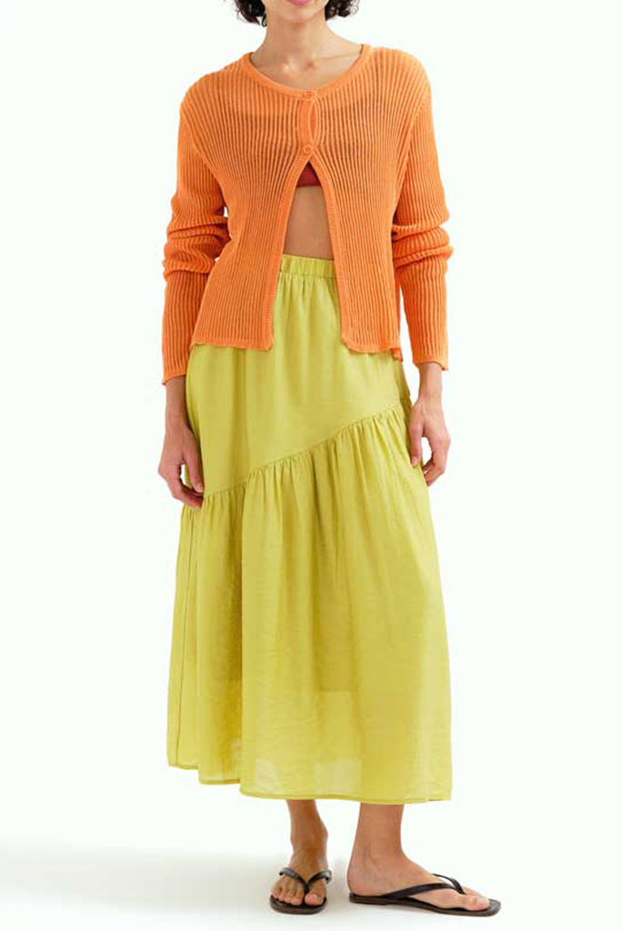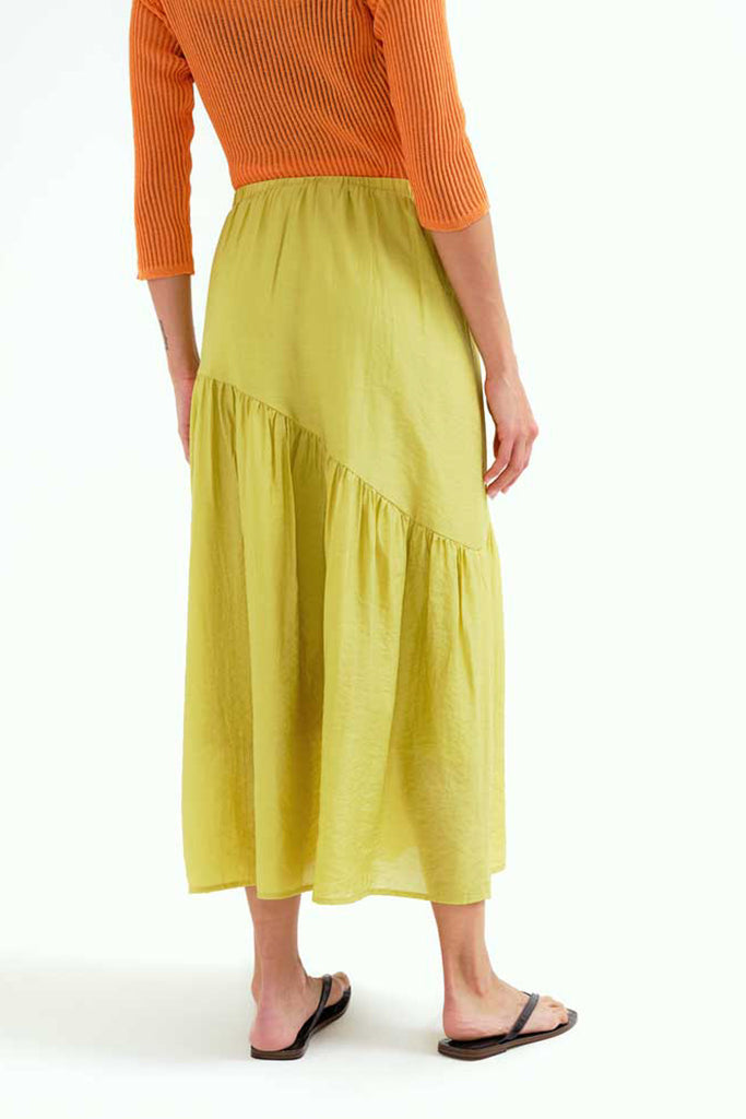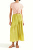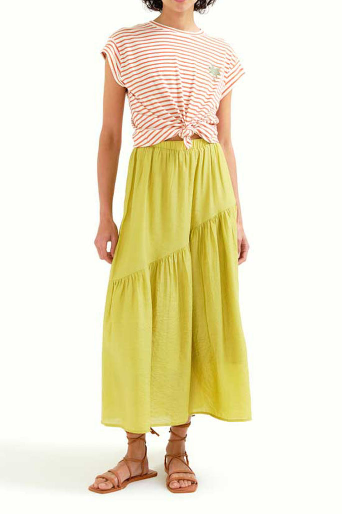 Compania Fantasticalightweight maxi skirt in muted citron green. lined skirt has a high-waisted fit and features a stretchy elastic waistband, asymmetrical ruffle detail, and a flowy fit. pair skirt with the talia stripe tee for the cute outfit pictured last or wear it with your favorite tank or tee to suit your own unique style.