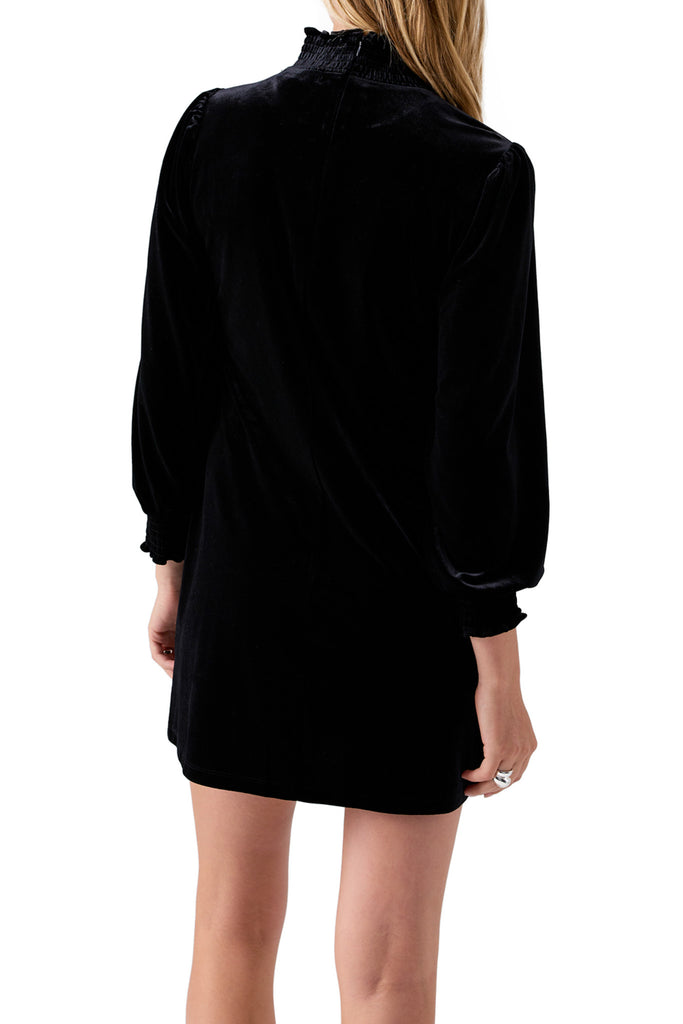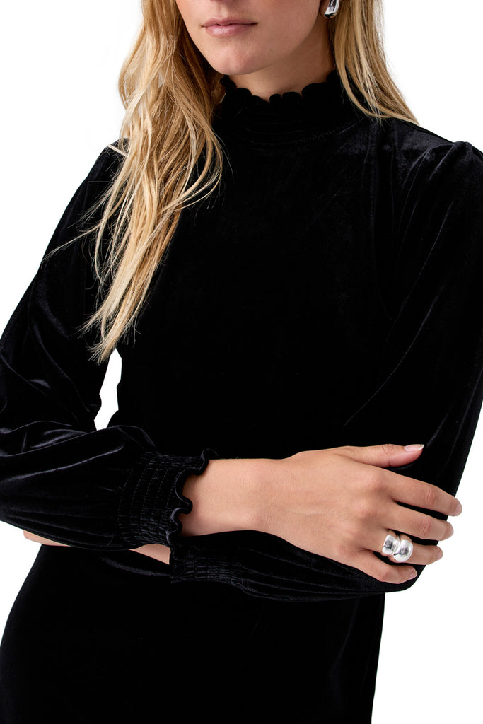 Personify Shopstriking black velvet fitted shift dress. dress features a ruffled mock neckline, slightly puffed shoulders, and long sleeves with smocked wrist cuffs. dress has darts at the bust and an invisible back zipper closure for a truly great fit. this is a perfect black velvet piece to wear throughout the holidays!