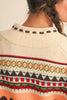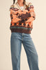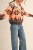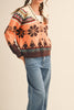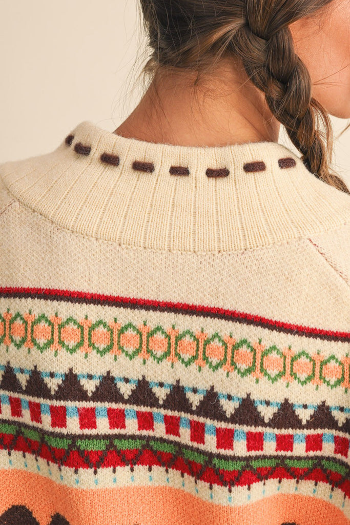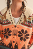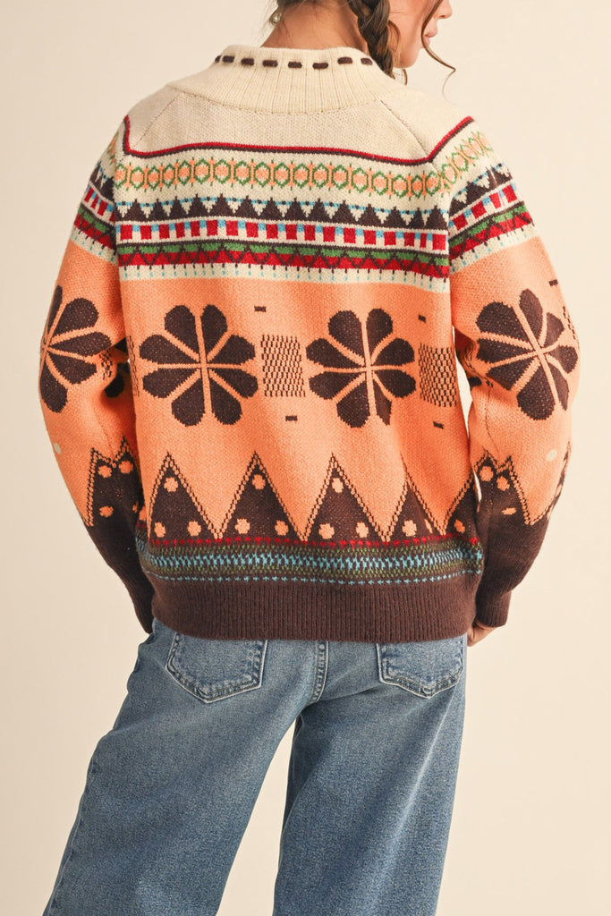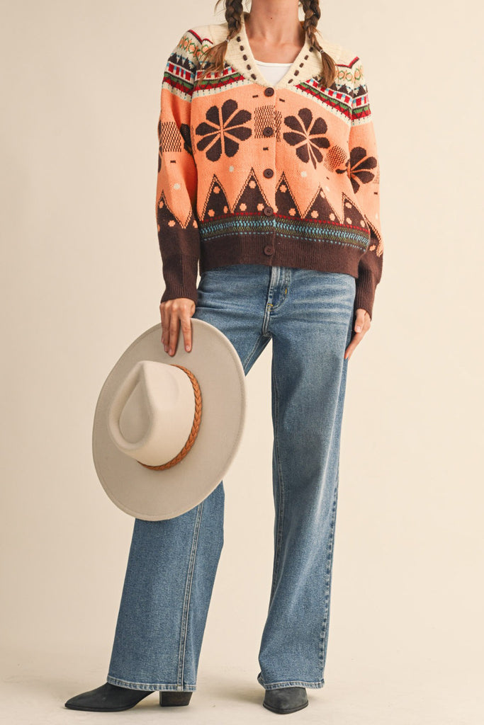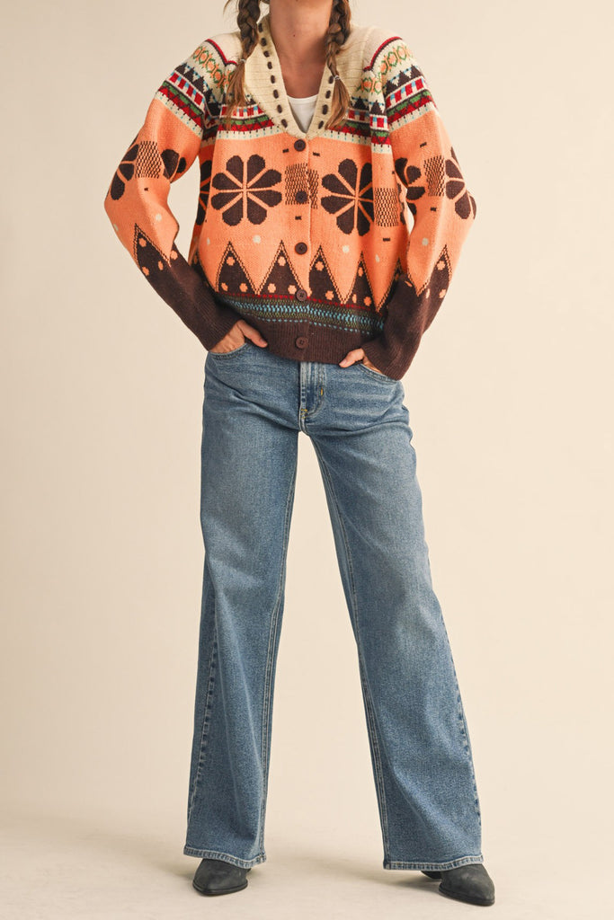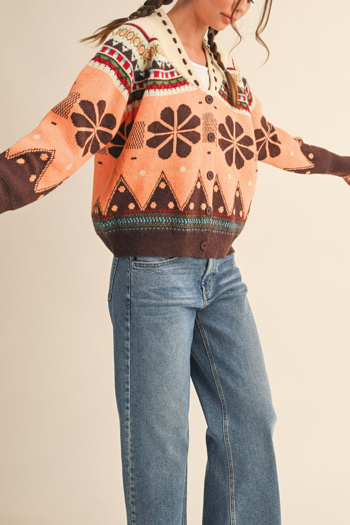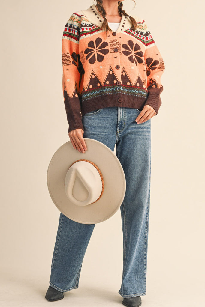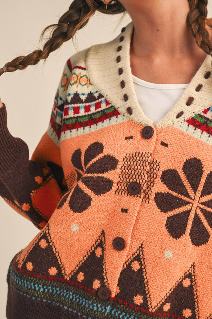 Personify Shopbeautifully knit sweater with a designer feel. sweater has a unique neckline with a colorful pattern on shoulders and a special floral graphic design below in peachy pink and chocolate brown. sweater features special stitched details on neckline, a button front, roomy long sleeves, and a relaxed fit. midweight sweater runs true to size.