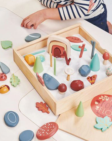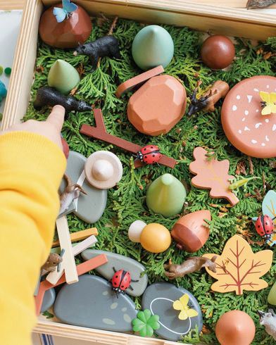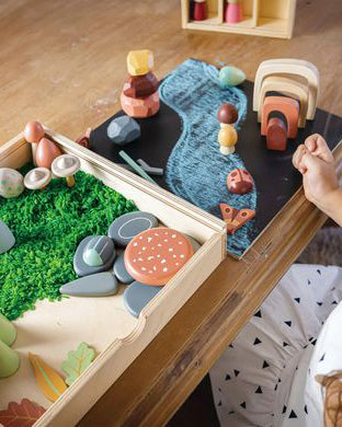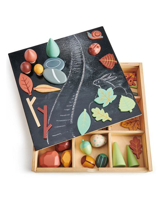 Personify Shopan award-winning extensive open-ended play tinker tray box for your little one to sort, stack, and arrange their woodland treasures. removable lid can be turned around and used as a chalkboard on which to create your forest floor. wooden compartments can also be removed and the box filled with sand to create a magical woodland play scene. set includes six grey flat pebbles, four multi-faceted rocks, three cone trees, eight twigs, a snail, a moth, six little toadstools, a large toadstool, ten leaves, two acorns, three beetles, four tunnel pieces, and a bird‘s egg.