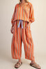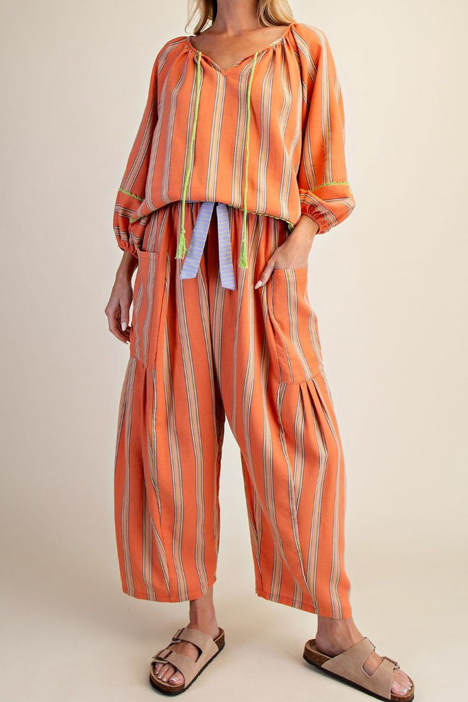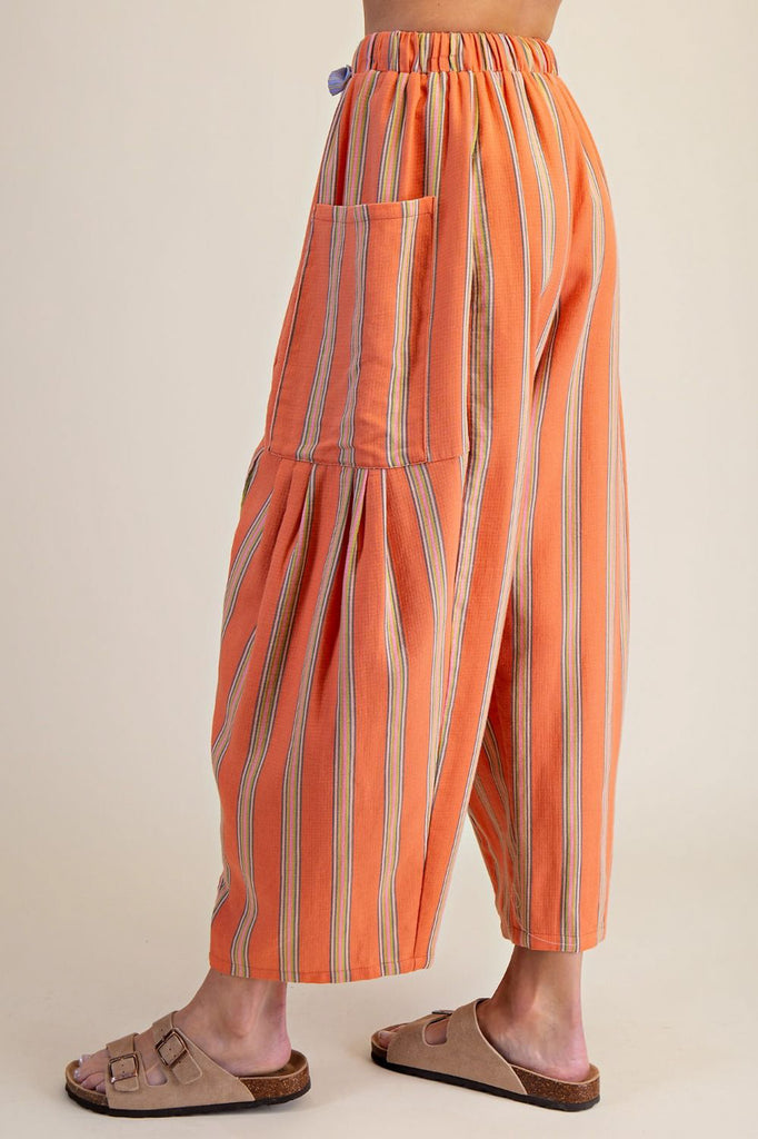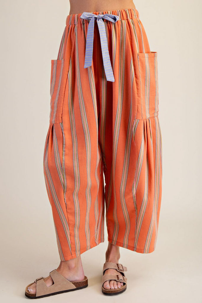 Personify Shopcomfy and fun barrel leg pants in summery orange stripes. pull-on pants are made from a lightweight, gauzy cotton and feature a stretchy elastic waistband with contrasting blue striped fabric tie, oversized patch pockets, and a roomy, cropped silhouette. breathable pants are perfect to wear all spring and into the summer.