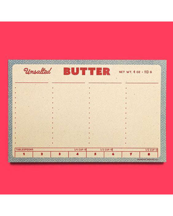 Personify Shopthoughtfully made notepad inspired by a stick of butter! pad is arranged into four columns; each column includes a blank header above bulleted spaces, allowing you to title each section and create your next list. pad is risograph printed in bright red and federal blue with red glue on the left edge.