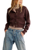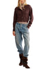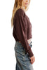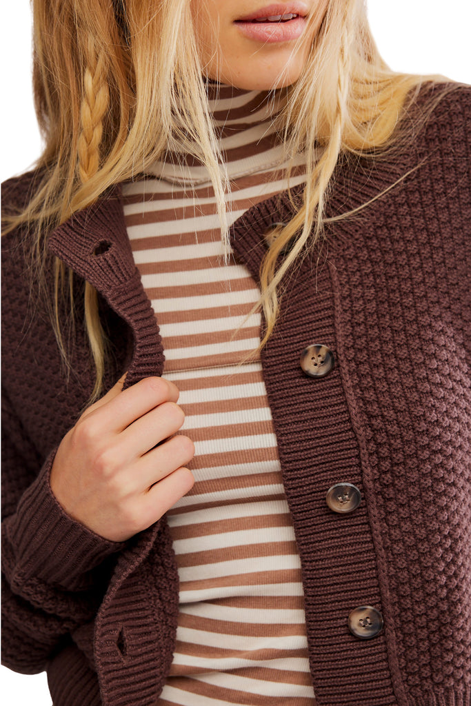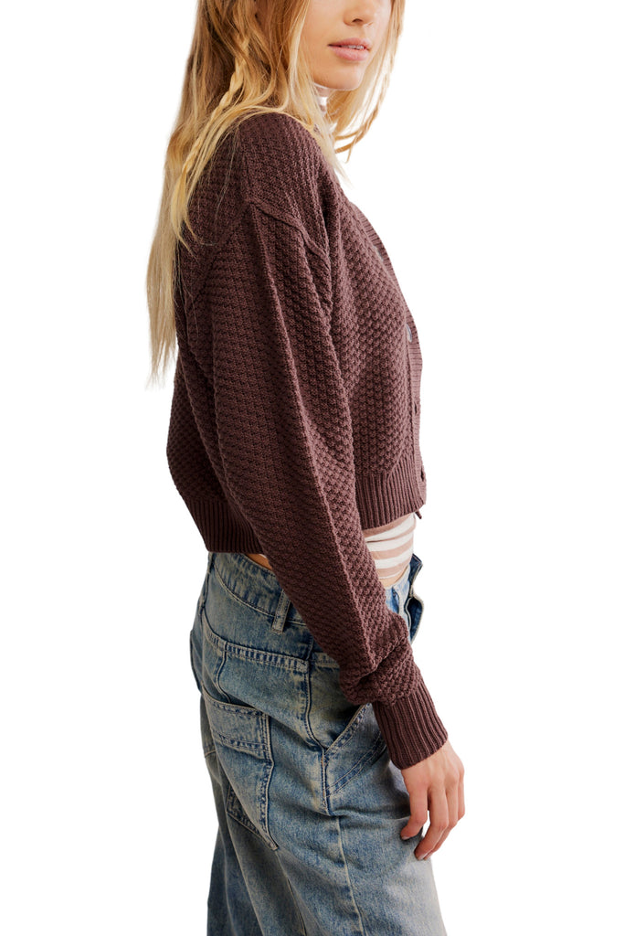 Personify Shopfree people textured cardigan in chocolate brown. woven cardigan has a button front with tortoise shell buttons and features a crew neckline, roomy long sleeves, and dropped shoulders for a casual, relaxed look. sweater can be styled many different ways into the fall and winter.