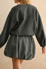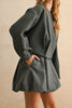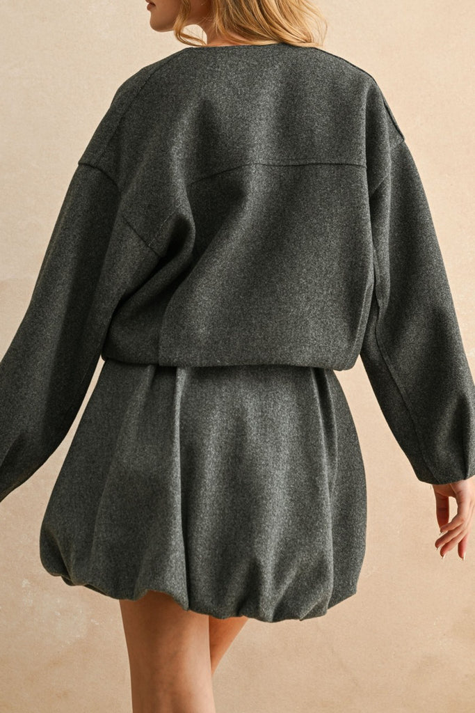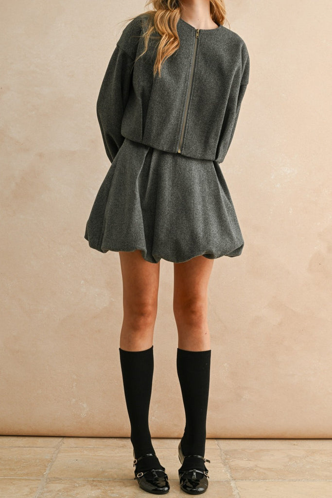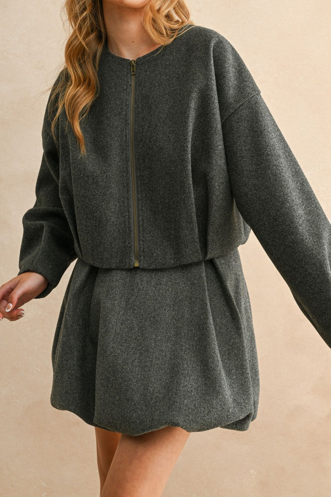 Personify Shopuniquely-shaped jacket in charcoal grey. jacket features a crew neckline, zippered front, dropped shoulders, roomy long sleeves, special pleated details at the waistline, and a slightly cropped length. midweight jacket makes a wonderful layer to wear this fall and winter.