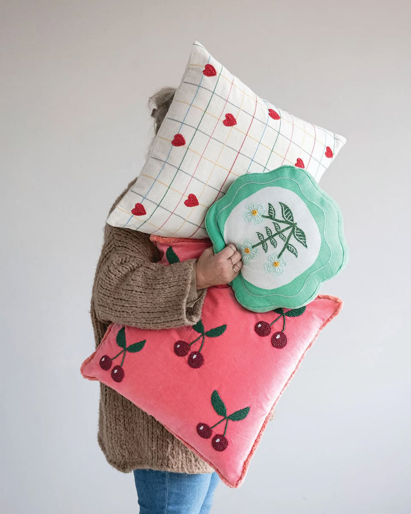 Personify Shopbeautifully made pillow with sweet embroidered details throughout. square pillow has a woven cotton fabrication and features a colorful embroidered grid pattern with embroidered red hearts throughout. it makes a lovely accent to any living space.