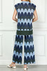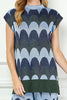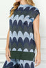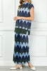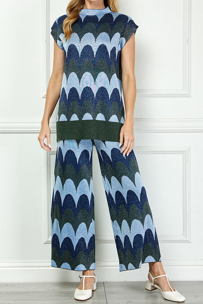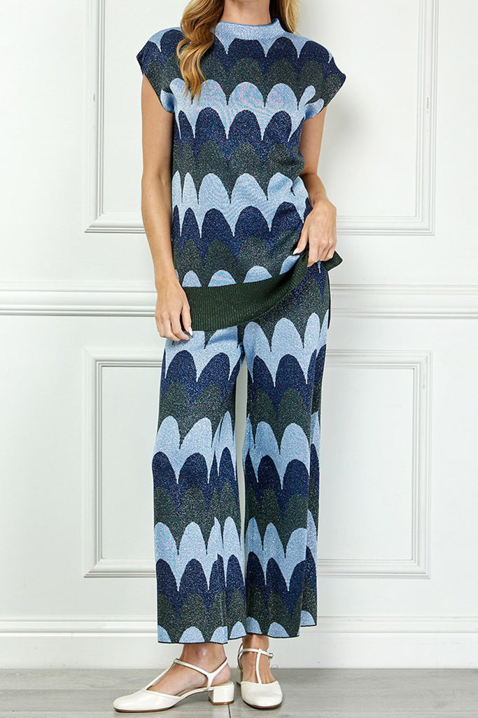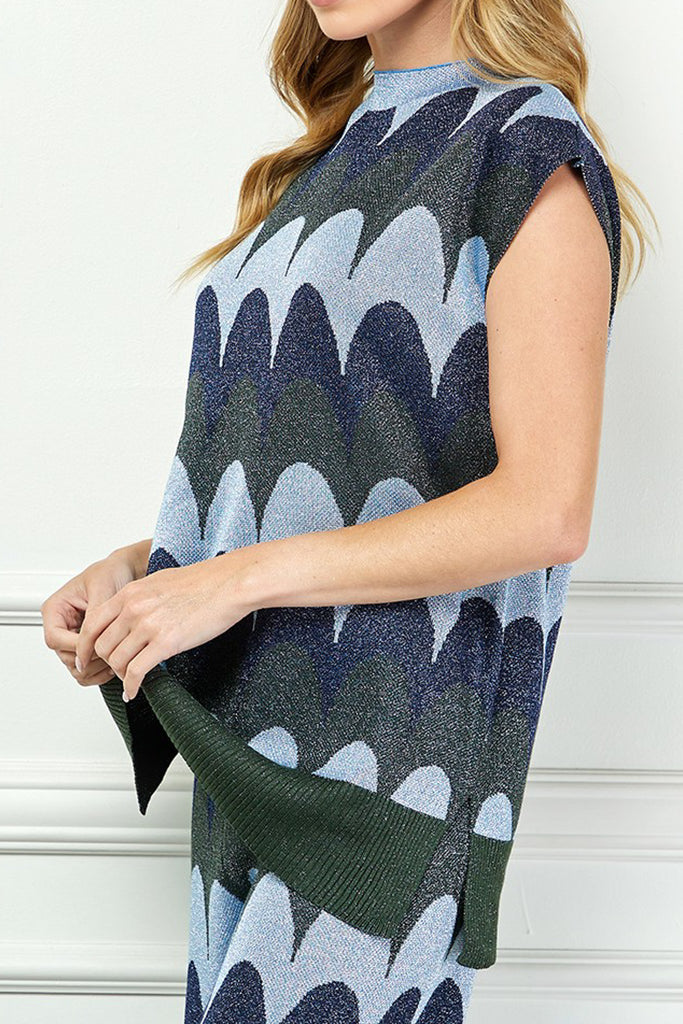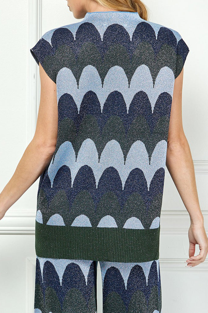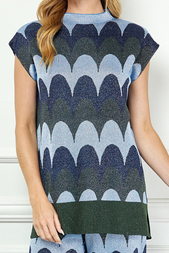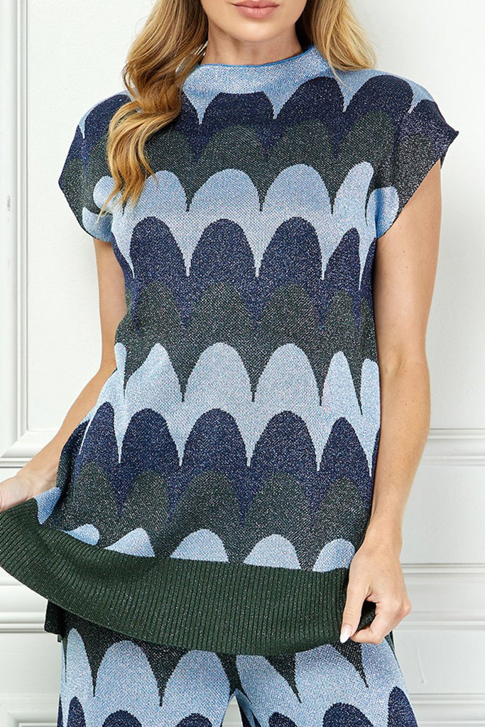 Personify Shopunique knit top with a scaled stripe design in varying shades of blue, grey, and deep olive green. top has special metallic threading throughout and features a high crew neckline, cap sleeves, a notched bottom hem, and a roomy fit. shimmery top is perfect for new year's and can be paired with the scaly metallic knit pants for the cute and coordinated look pictured last. top also looks great with black pants, a skirt, or your favorite jeans.