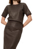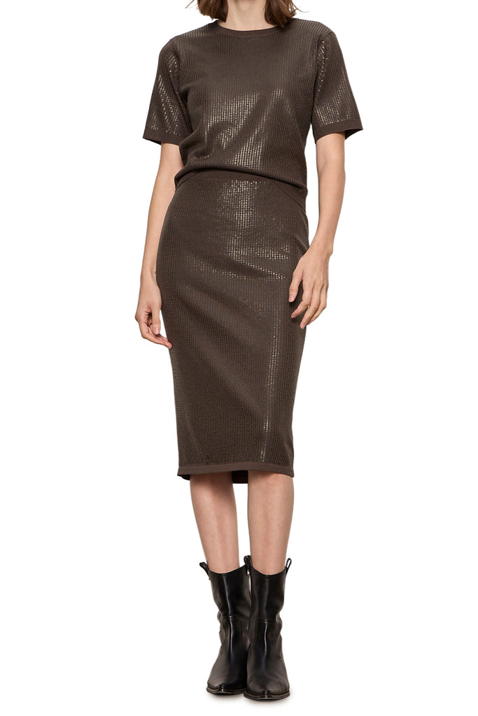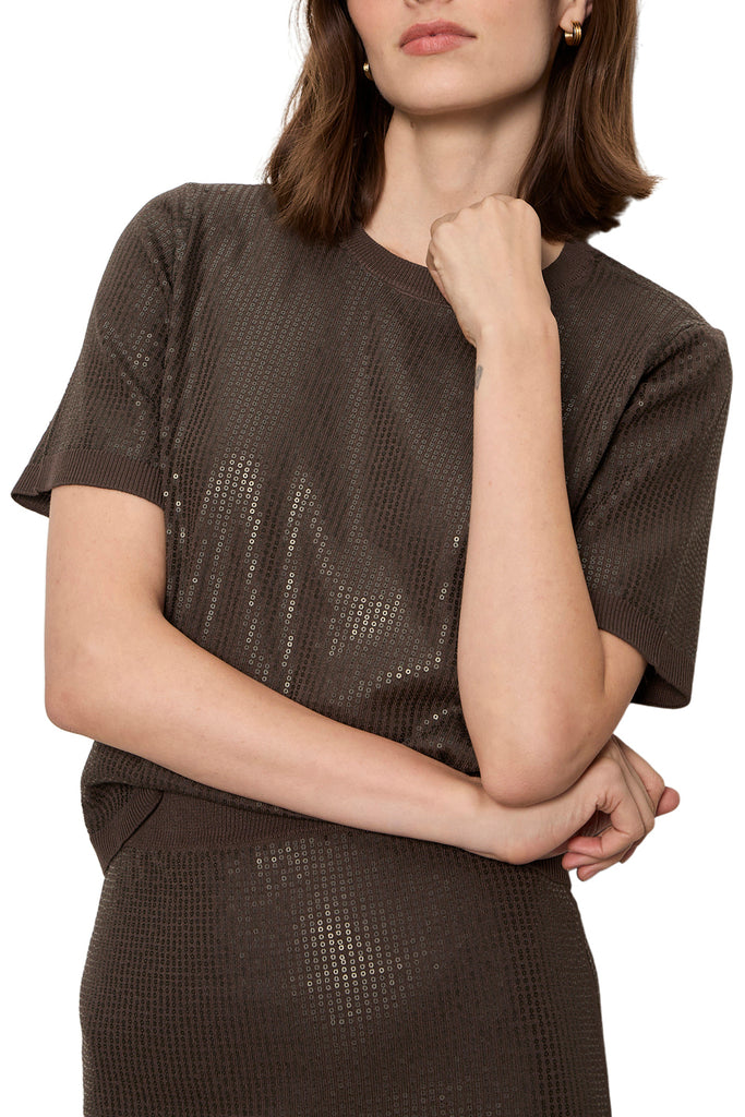 Personify Shopsequined sweater top in deep chocolate brown. top is finely knit with a soft fabrication and is covered in delicate sequins throughout. it features a crew neckline, ribbed cuffs, and a relaxed fit. top makes an easy to wear piece for the holidays.