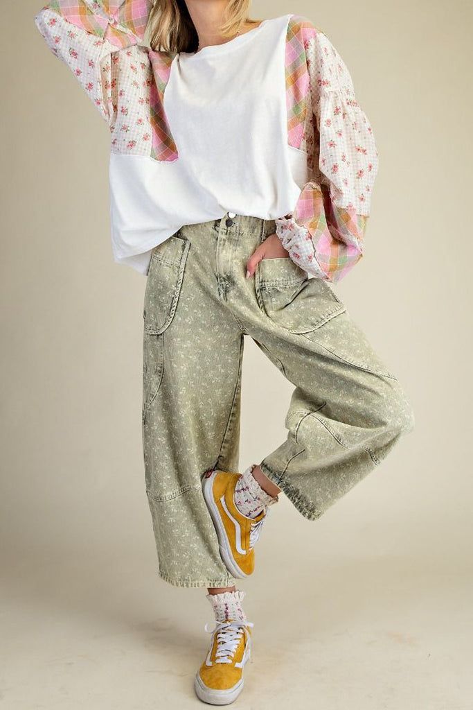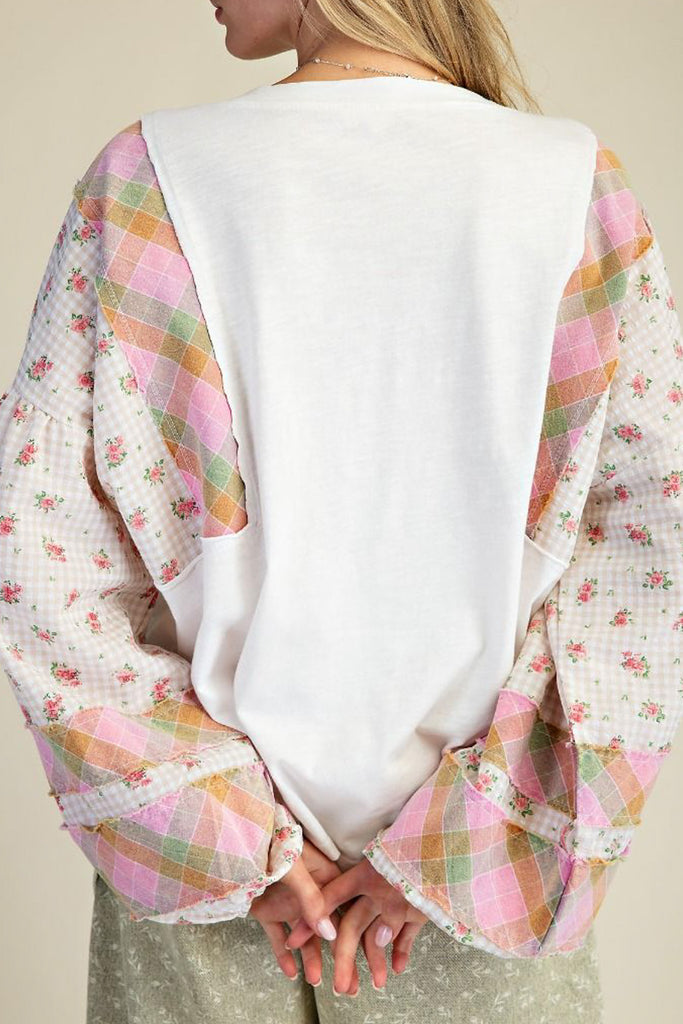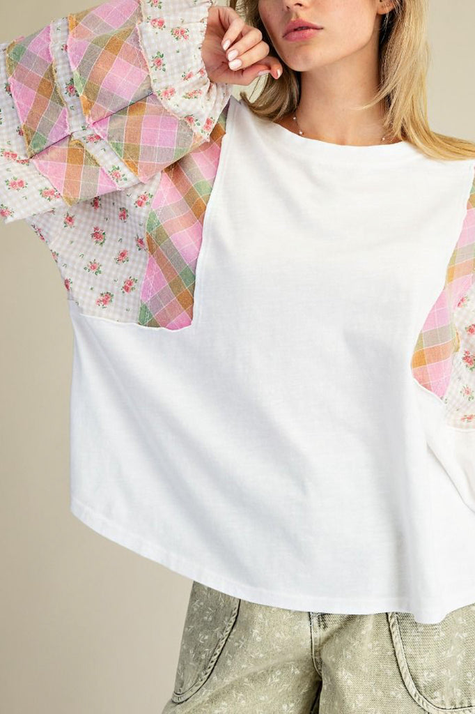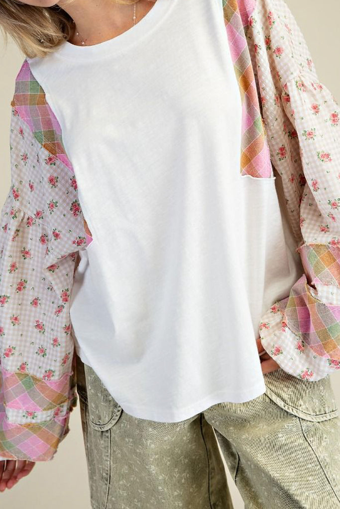Personify Shopoversized long sleeve tee with special patchwork details on sleeves. relaxed fit top has a soft, cotton slub body and features a crew neckline, roomy long sleeves, and a slightly boxy silhouette. easy to wear top is an elevated casual piece and can be styled with jeans, shorts, or your favorite bottoms.