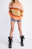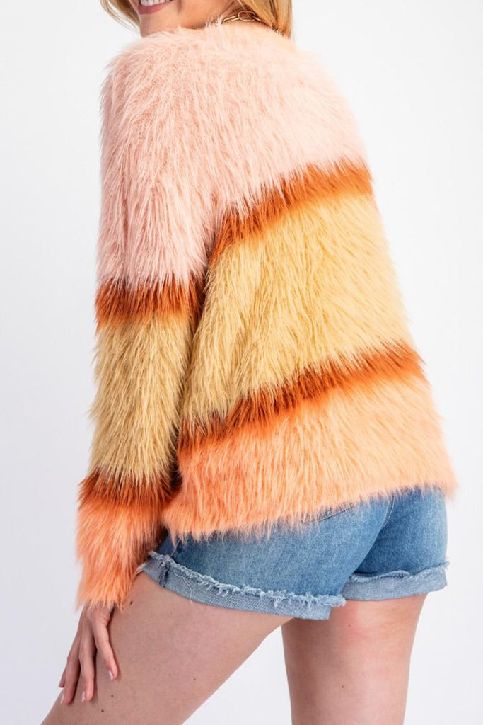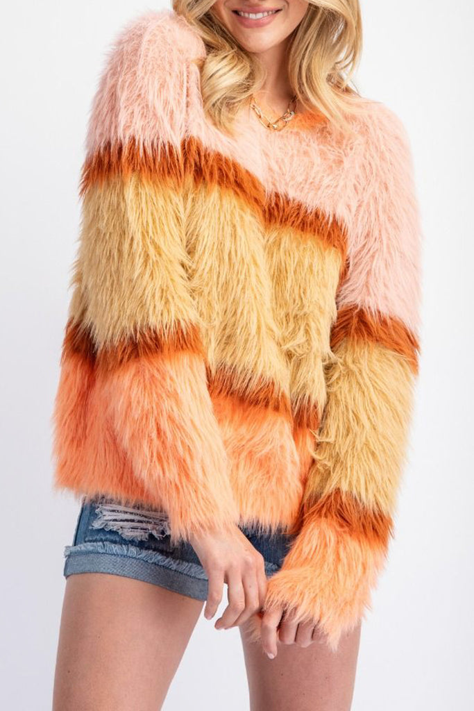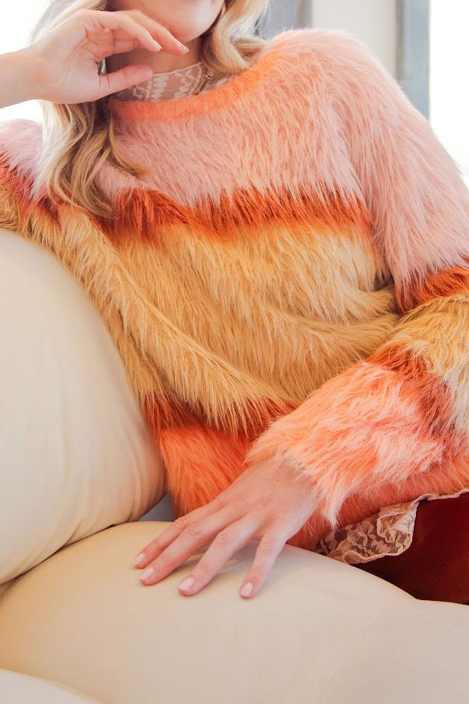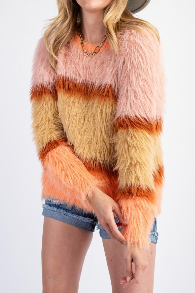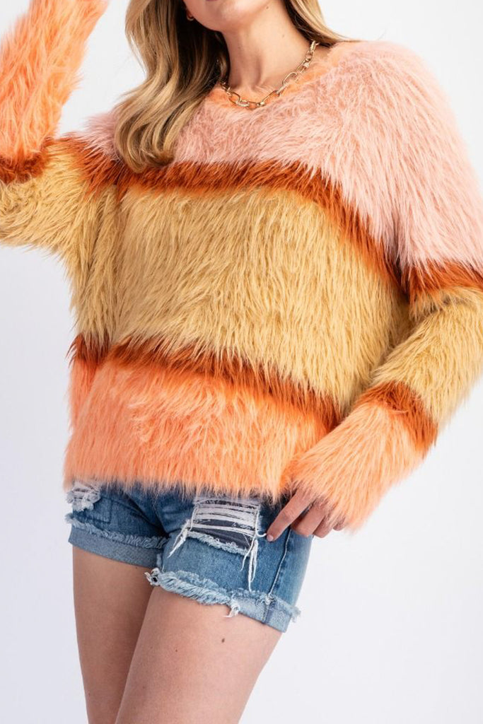 Personify Shopunique fuzzy pullover with a color blocked design in light pink, burnt orange, yellow, and peachy coral. pullover is very soft and has a classic silhouette with a crew neckline and oversized fit. special, cozy sweater is perfect for everyday wear with jeans or your favorite bottoms.
