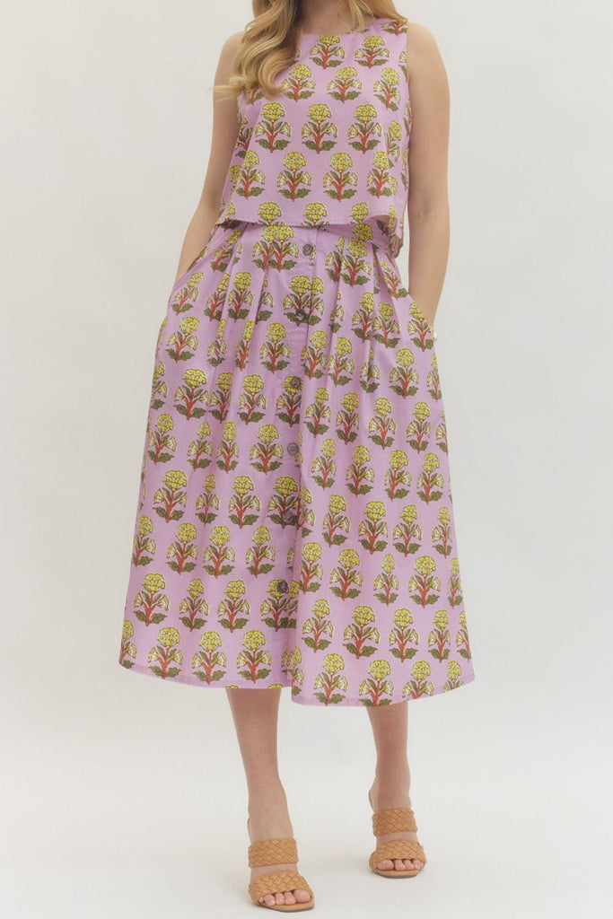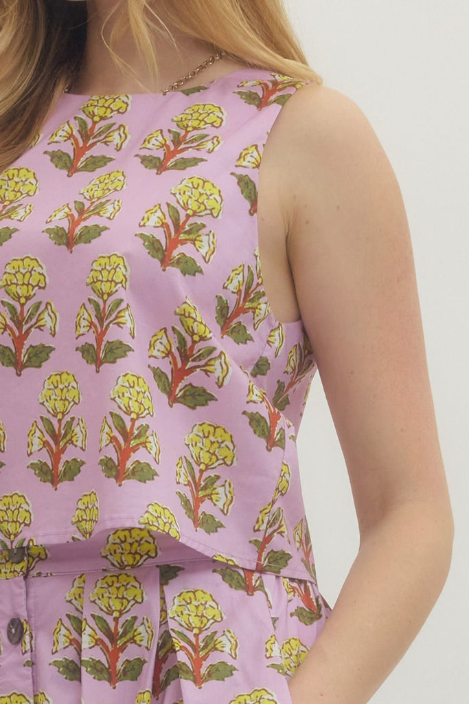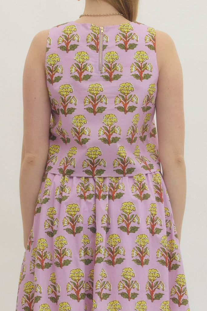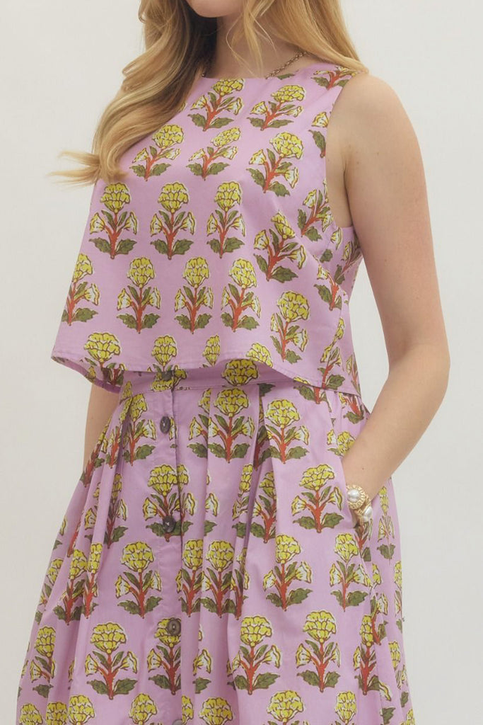 Personify Shopsleeveless top in a springy lavender floral print. top features a crew neckline, exposed zipper on back, and a high-low hemline. it can be paired with the tabitha lavender printed skirt for the pretty, coordinated look pictured here, or easy to wear top can be worn with your favorite jeans or shorts for a more casual vibe.