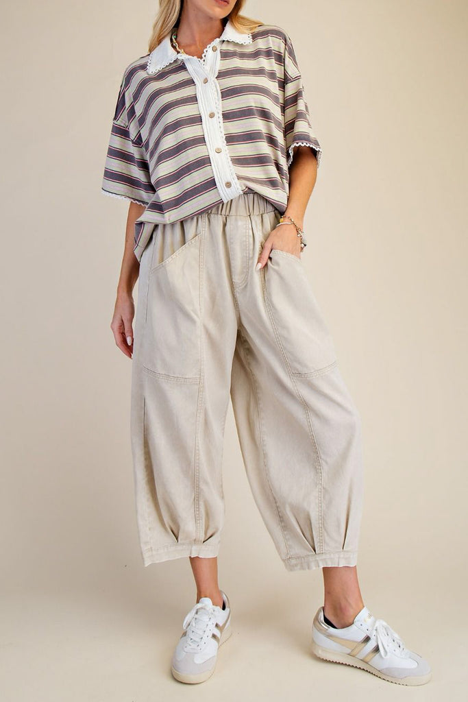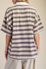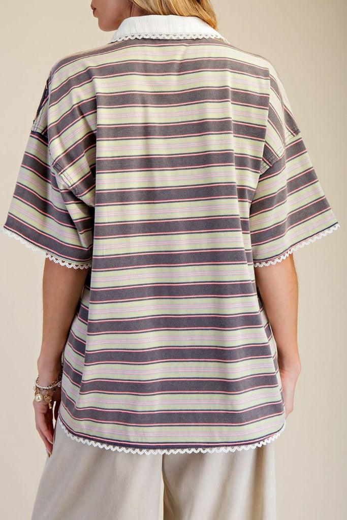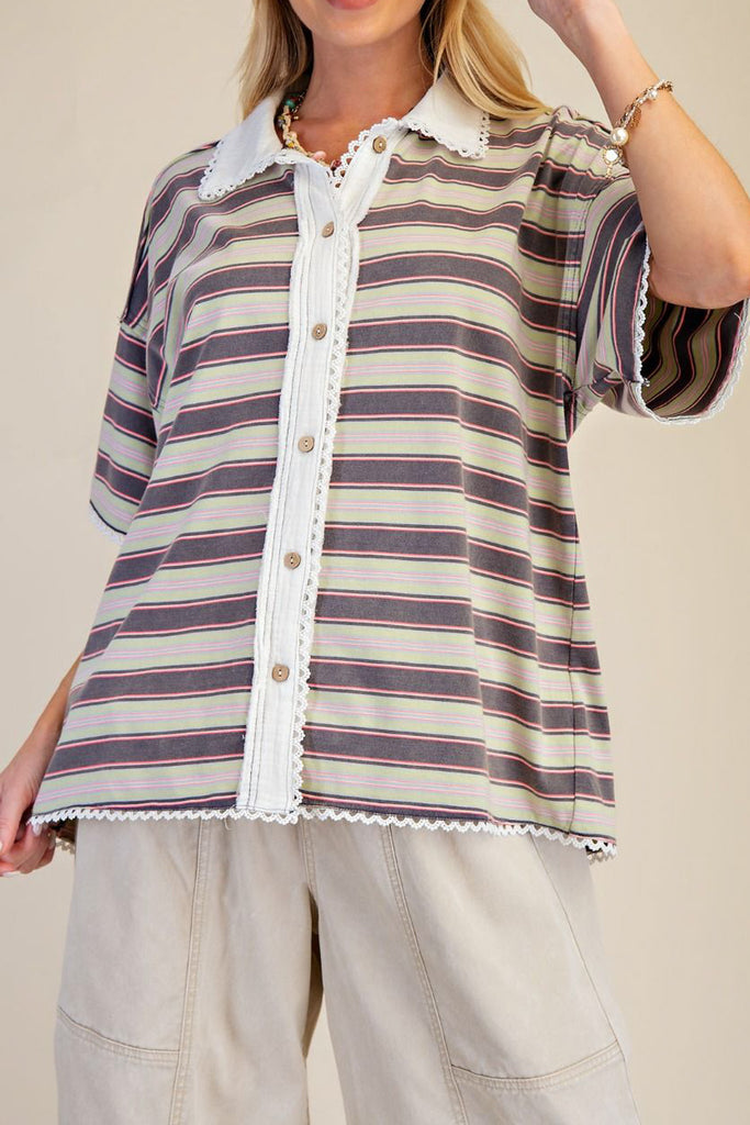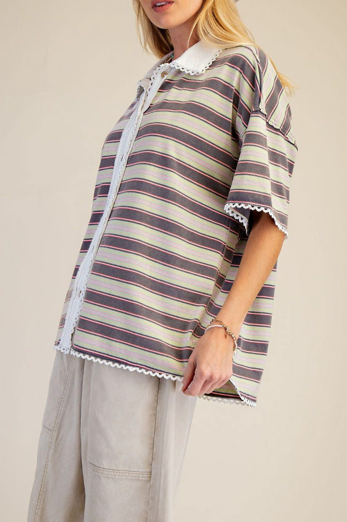 Personify Shopspecial button down tee in muted springy toned stripes. soft and comfortable tee has an oversized fit and features a collar, button front, dropped shoulders, roomy short sleeves, and sweet lace trim details throughout. casual and cool top can be styled with your favorite jeans or shorts this spring and into the summer.