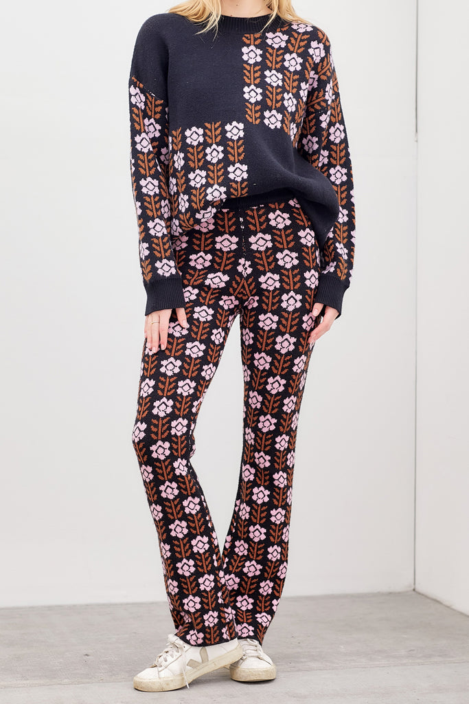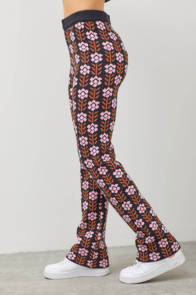 Personify Shopstretchy black knit pants with floral pattern in brown and light pink. comfortable pants feature an elastic waistband and straight leg fit with a slightly cropped length. pair with the welles floral top for the cute, coordinated look pictured here or wear with your favorite neutral top to suit your own unique style.