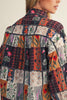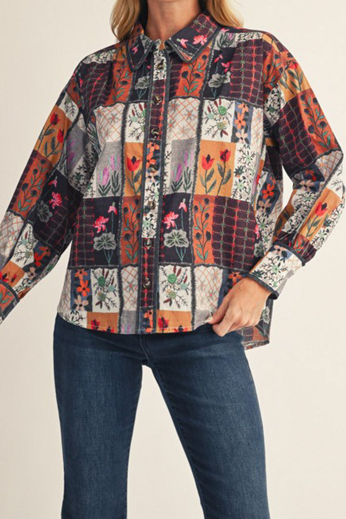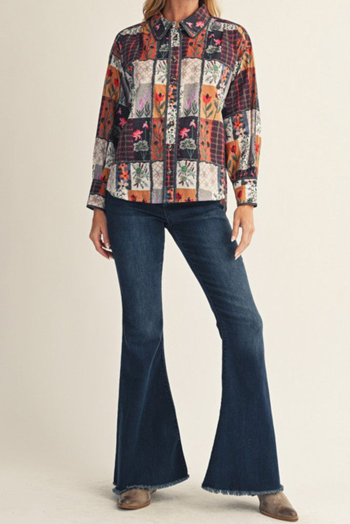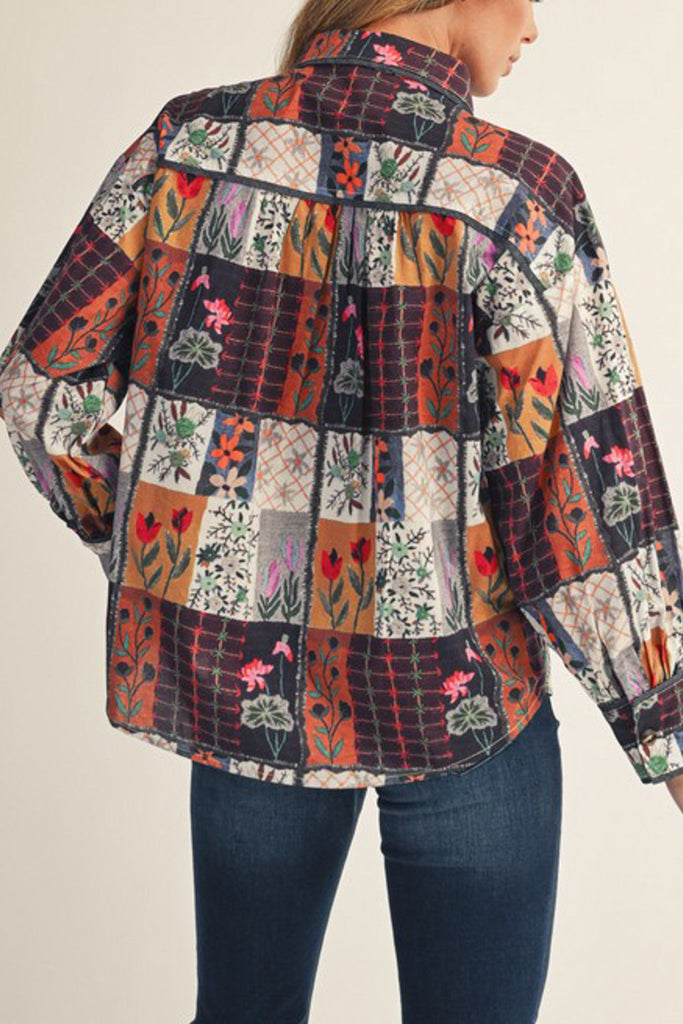 Personify Shopbutton down top in unique patchwork design. top has a boxy silhouette and features a petite collar, roomy long sleeves with buttoned wrist cuffs, a slightly longer back hem, and a embroidered seam details throughout. style top casually with jeans or dress it up with black pants or a skirt.